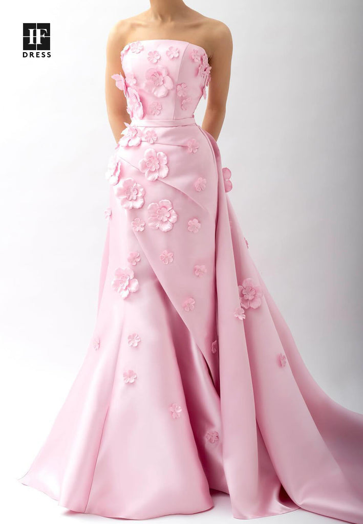 Tube Top Sleeveless Pleated Satin Formal Gowns Floral Embellished Train Mermaid Evening Dress