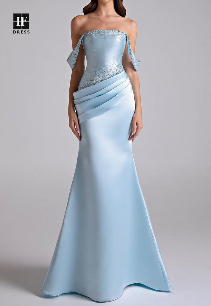 Tube Top Off-Shoulder Prom Gowns Sleeveless Beaded Pleated Satin Mermaid Evening Dress