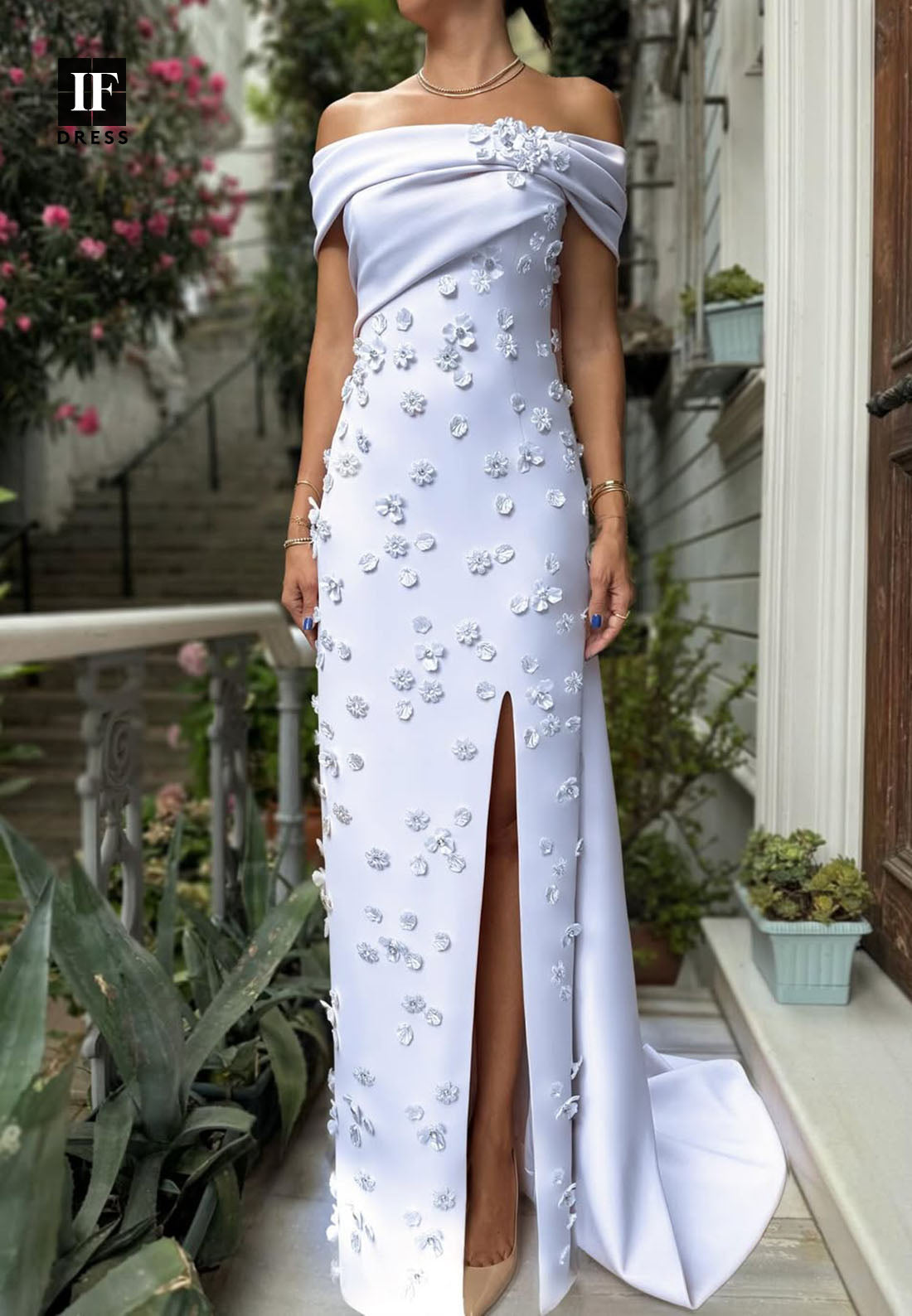 Elevate your formal wardrobe with this sophisticated evening dress, featuring an elegant bateau neckline that transitions into graceful off-shoulder styling. The fitted silhouette is crafted from luxurious satin, enhanced with intricate floral embellishments that add refined texture and visual interest. Strategically placed pleats create dimensional movement while maintaining a polished, structured look. Perfect for galas, weddings, and upscale events, this gown combines timeless elegance with contemporary design details. The combination of tailored construction and ornamental flourishes ensures you'll make a memorable impression at any formal occasion.