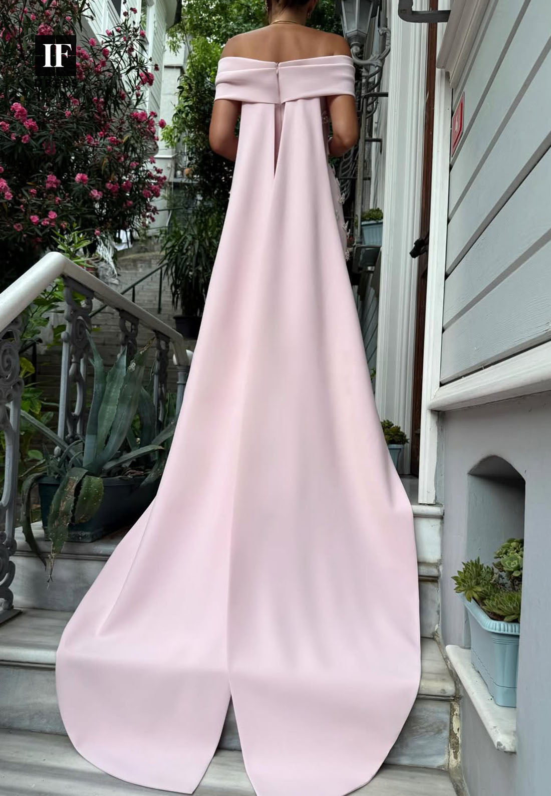 Bateau-Neck Off-Shoulder Fitted Evening Dress Floral Embellished Satin Pleated Formal Gowns - Blushing Pink is backordered and will ship as soon as it is back in stock.