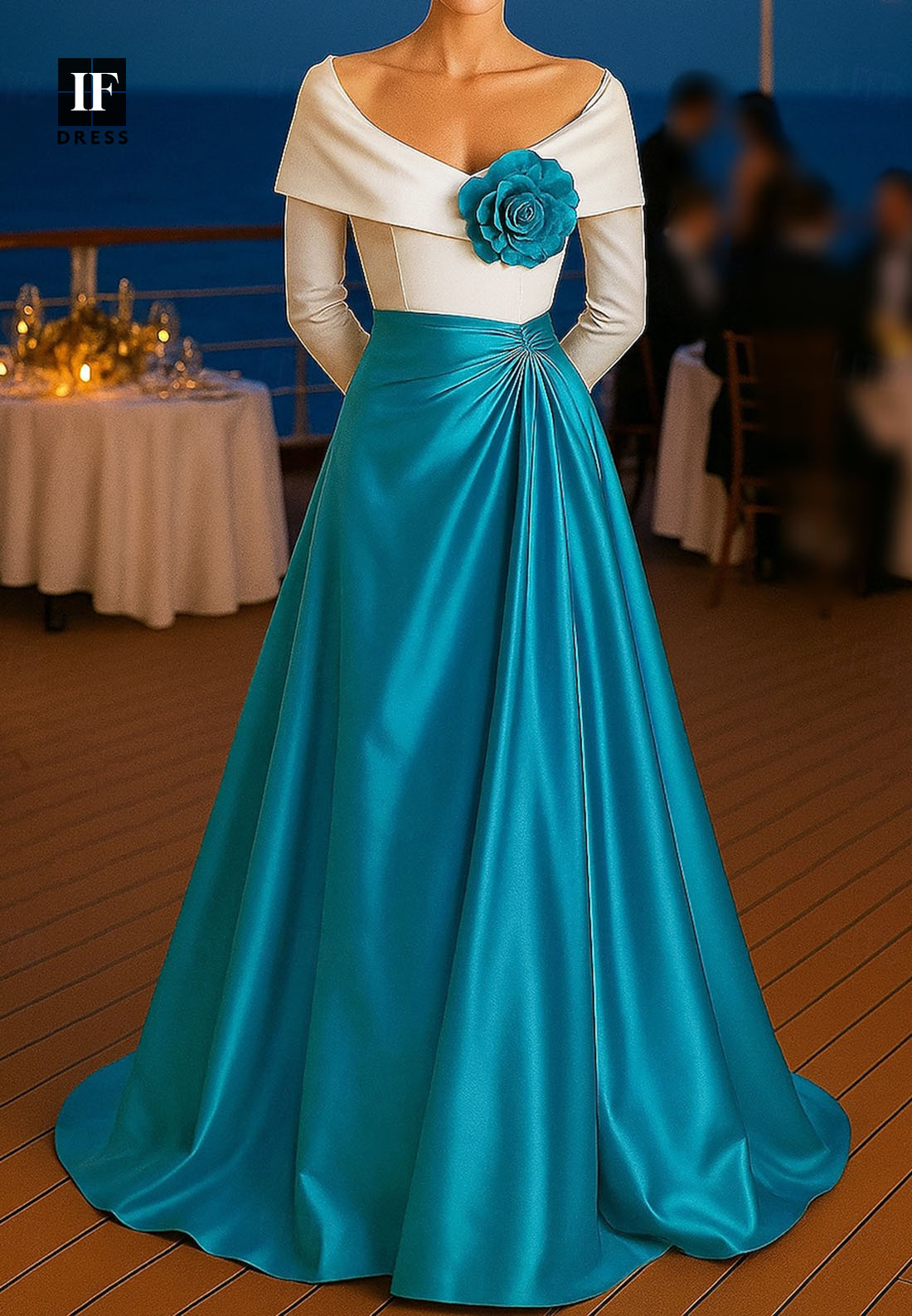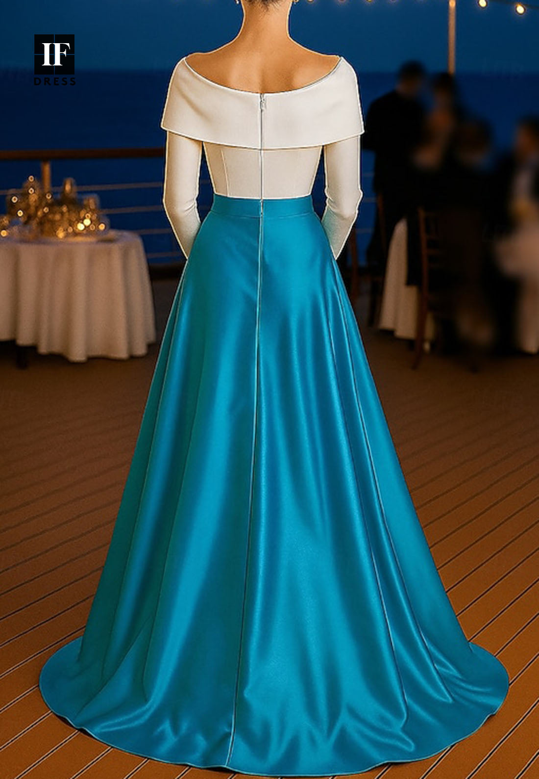 Elevate your formal wardrobe with this sophisticated two-tone satin evening dress. The graceful A-line silhouette flatters all figures, while delicate pleating adds dimension and movement to the skirt. Long sleeves and a refined scoop neckline create an elegant, timeless aesthetic perfect for galas, weddings, and black-tie events. Crafted from luxurious satin fabric, this gown drapes beautifully and catches light with subtle sophistication. The contrasting color blocking enhances the dress's modern appeal while maintaining classic formal elegance. An ideal choice for those seeking a polished, statement-making look.