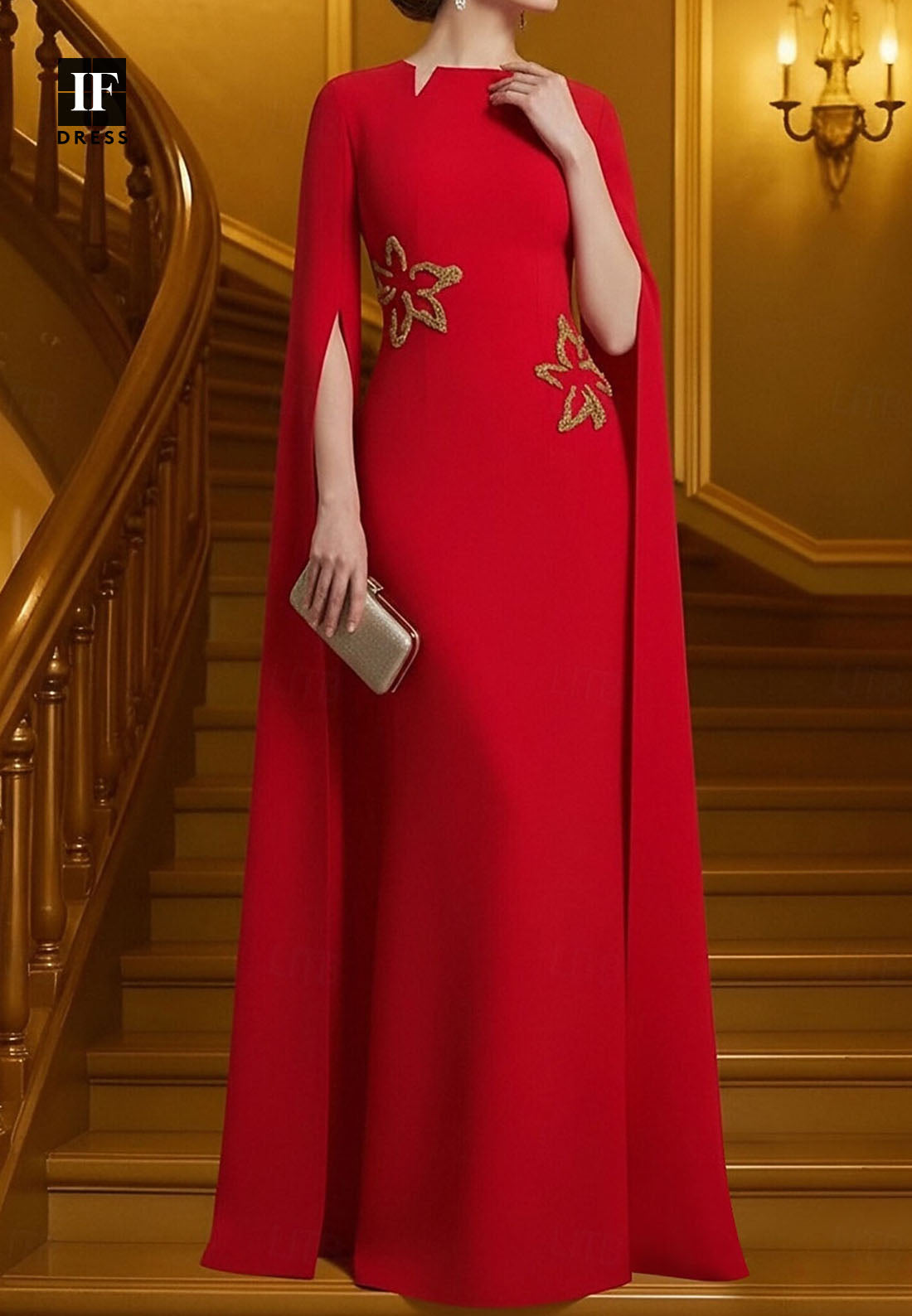 Scoop-Neck Cape-Sleeves Floor-Length Beaded Satin Pleated Mermaid Evening Dress
