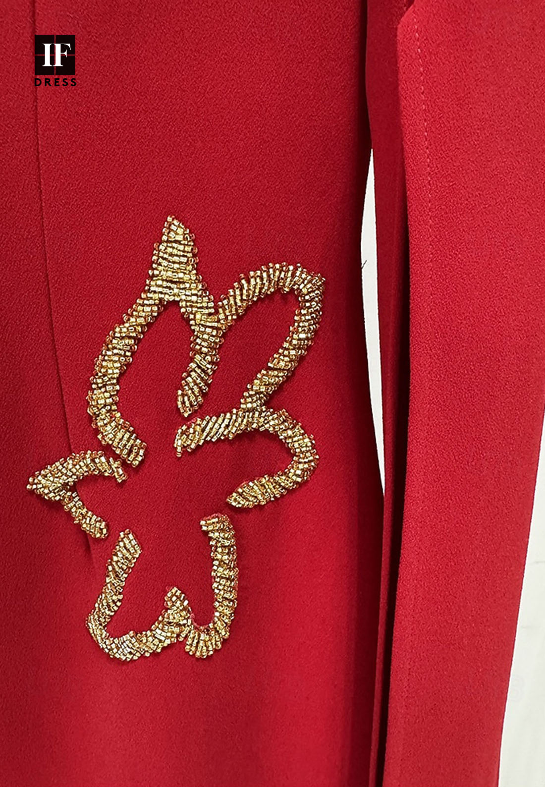 Command presence in this elegant formal gown with a graceful scoop neckline and dramatic cape sleeves that add movement and sophistication. Sumptuous satin fabric provides a luxurious foundation with beautiful drape, while intricate pleating throughout the bodice creates dimensional texture and flattering curves. Delicate beading adorns the dress with refined sparkle and embellishment. The mermaid silhouette hugs your form before releasing into a floor-length train for striking visual impact. This meticulously crafted piece seamlessly blends classic evening wear elegance with contemporary styling, positioning it as an exceptional choice for formal galas, milestone celebrations, and upscale events where timeless sophistication and impeccable tailoring are valued.