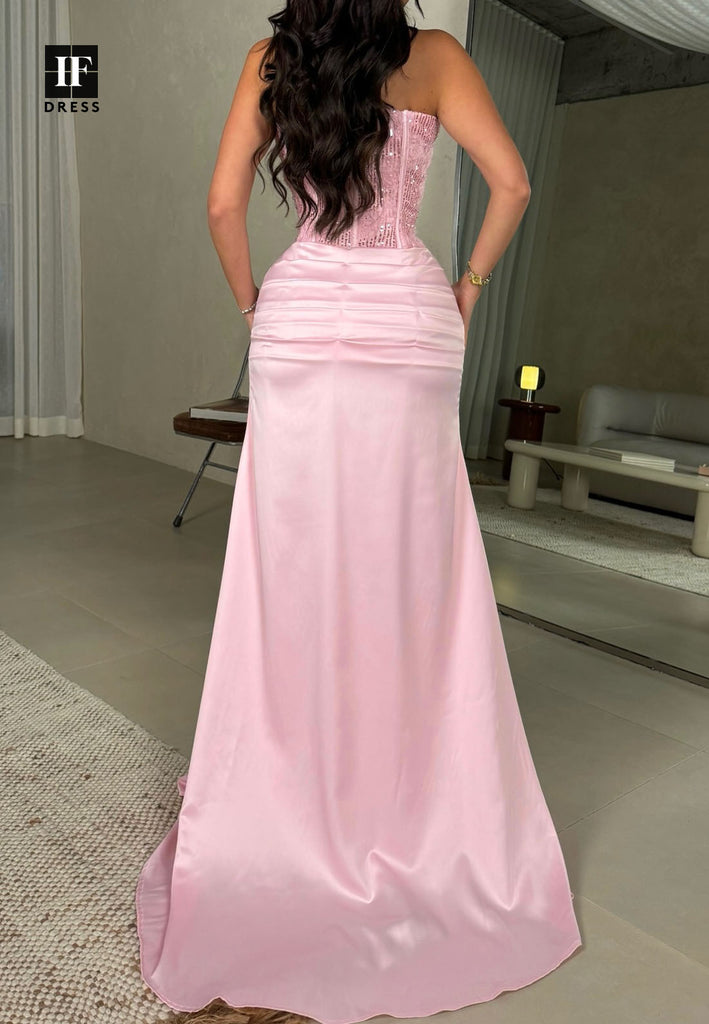 Tube Top Off-Shoulder Sleeveless Sequined Applique Pleated Satin Mermaid Evening Dress with Sweep Train - Candy Pink is backordered and will ship as soon as it is back in stock.