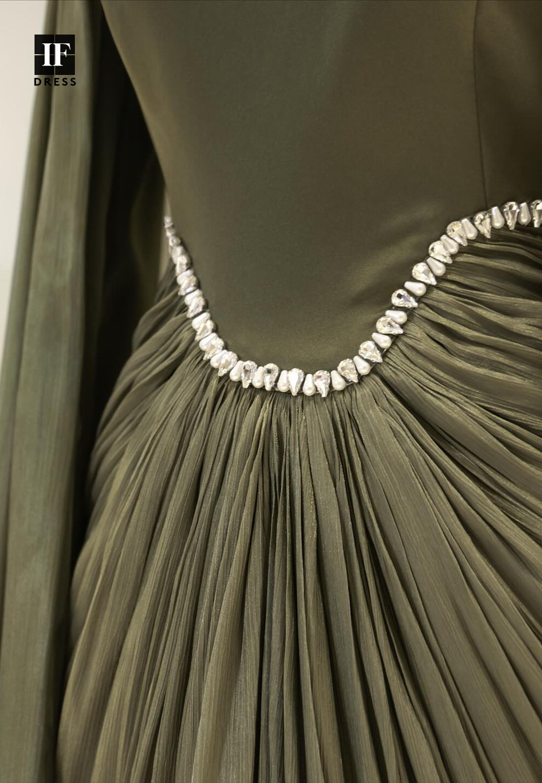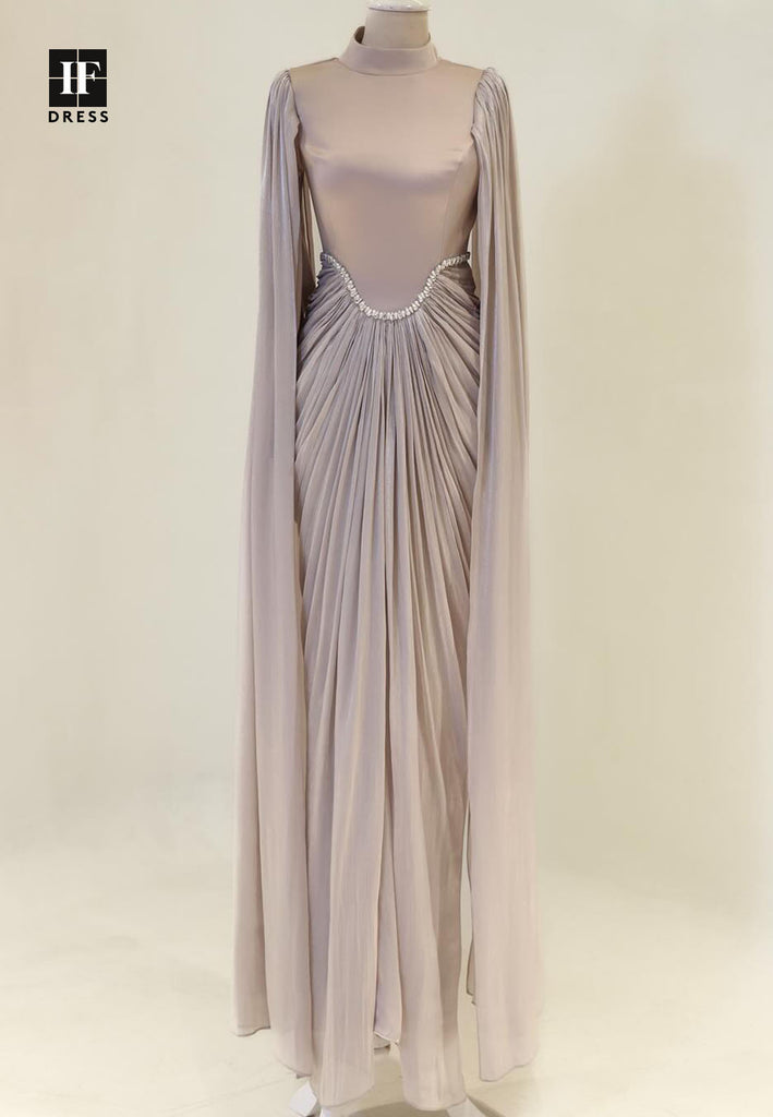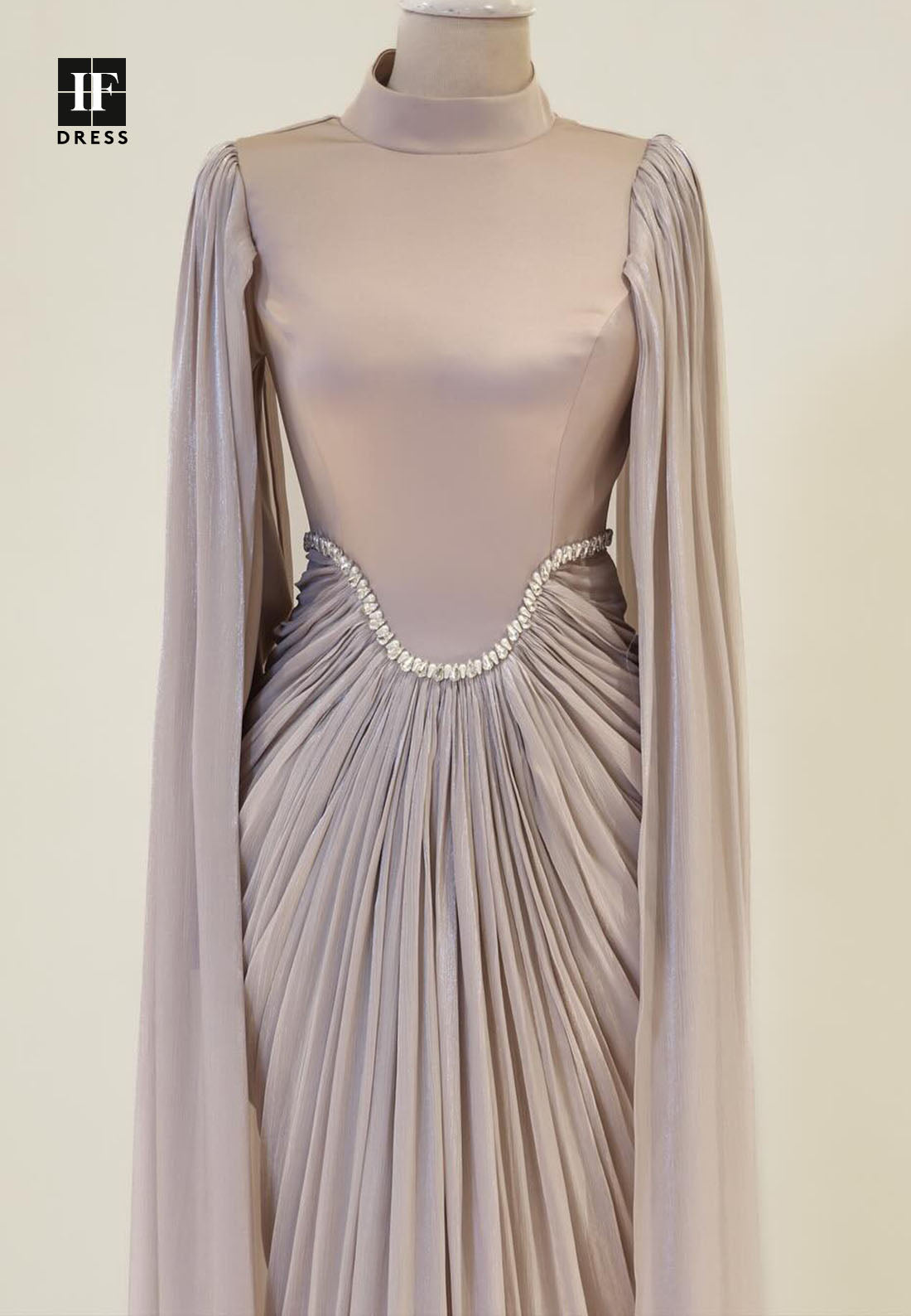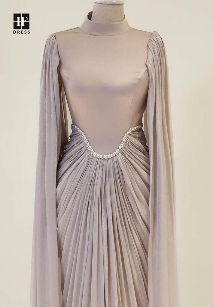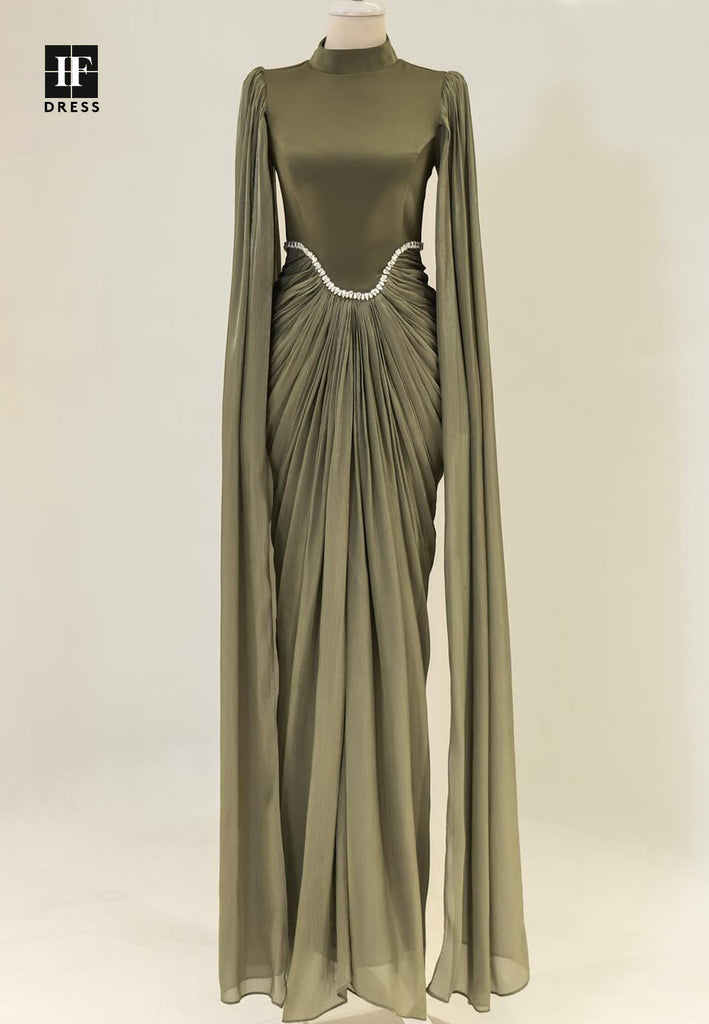 High-Neck Long-Sleeves Floor-Length Rhinestone Pleated Chiffon Meramid Evening Dress