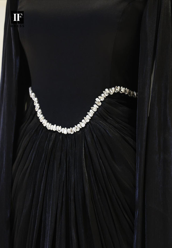 High-Neck Long-Sleeves Floor-Length Rhinestone Pleated Chiffon Meramid Evening Dress - Black is backordered and will ship as soon as it is back in stock.