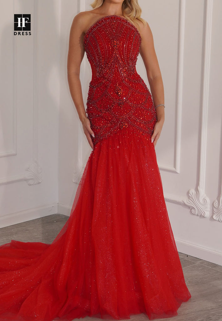 Sweetheart Sleeveless Pleated Fully Sequined Beaded Mermaid Evening Dress with Tulle Gloves