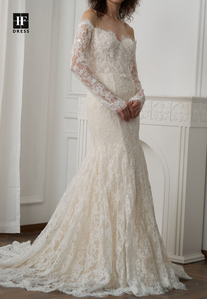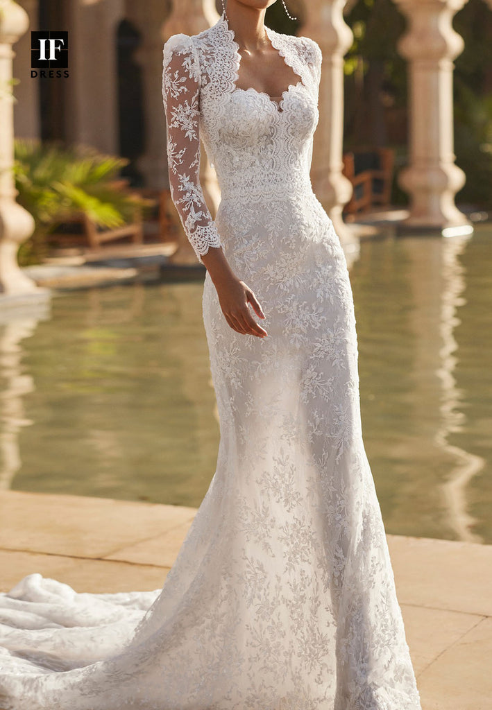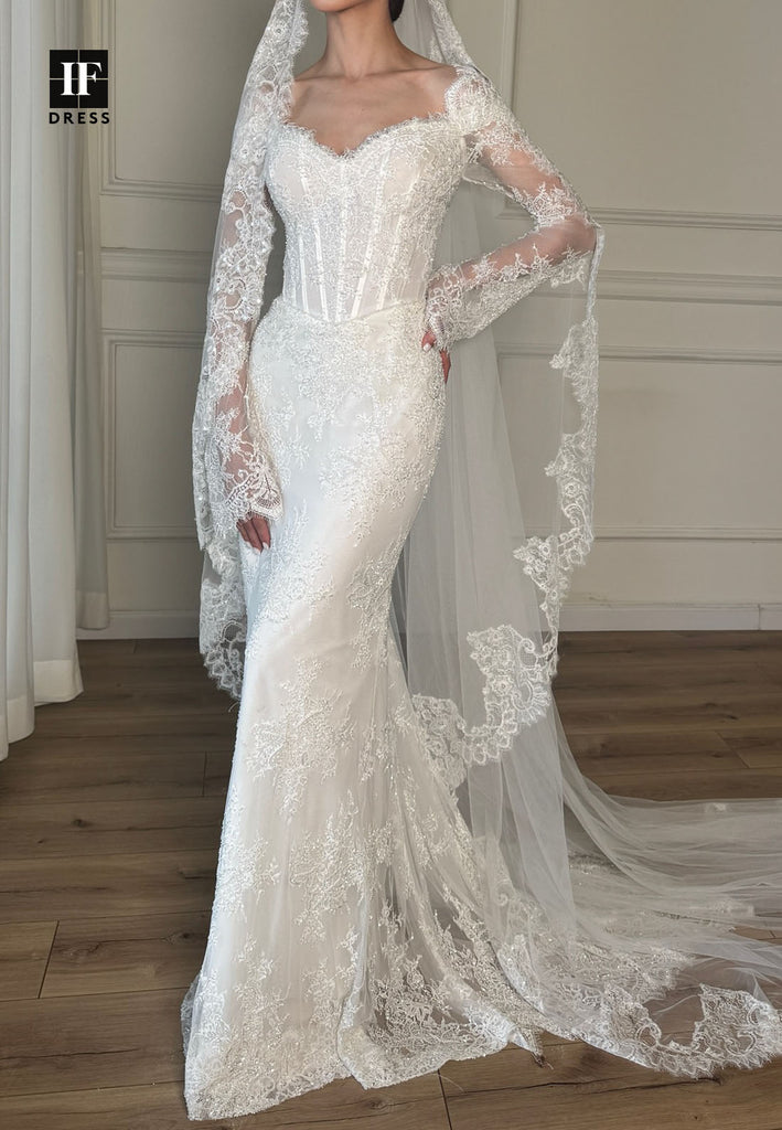 Sweetheart Long-Sleeves Beaded Sequined Lace Applique Pleated Mermaid Wedding Dress with Train
