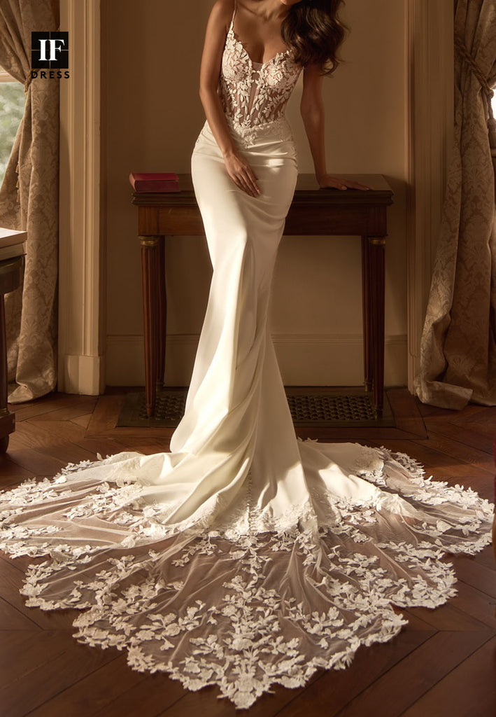 V-Neck Spaghetti Straps Satin Sheer Bride Gowns Sleeveless Applique Mermaid Wedding Dress