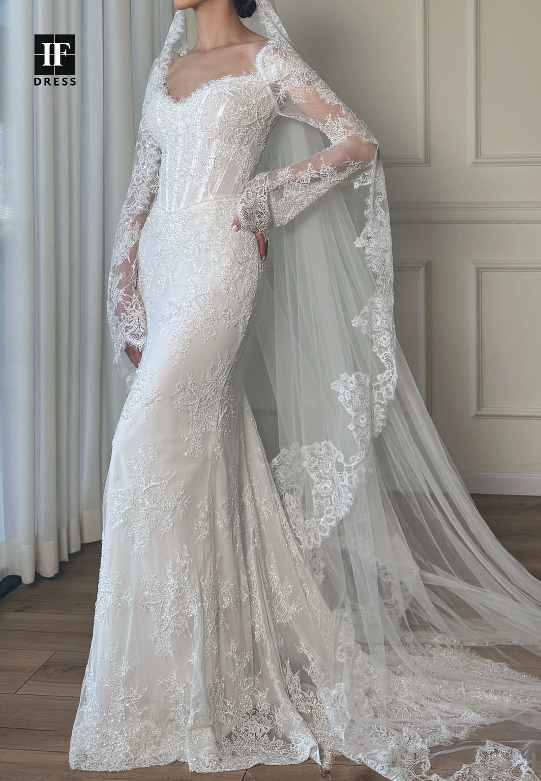 This mermaid wedding dress showcases a sweetheart neckline and long sleeves, fully embellished with intricate sequined and beaded lace appliques. The fitted silhouette accentuates the bride’s curves, offering a dramatic yet elegant look for a memorable bridal statement. Designed with expert craftsmanship, this gown blends sparkle and sophistication for a truly stunning wedding day ensemble.