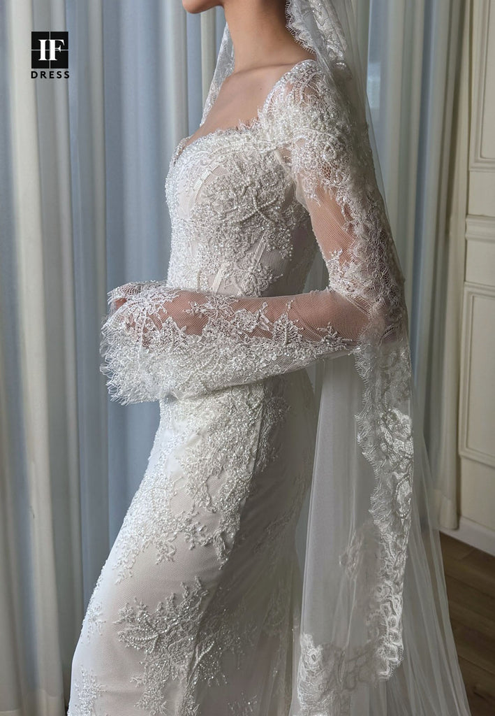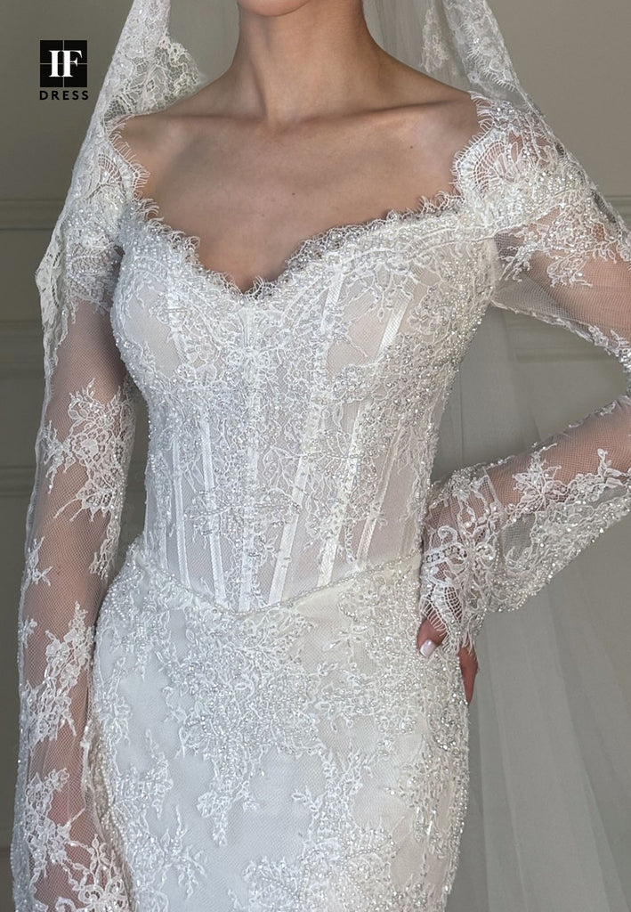 Sweetheart Long-Sleeves Bride Gowns Fully Sequined Beaded Applique Mermaid Wedding Dress