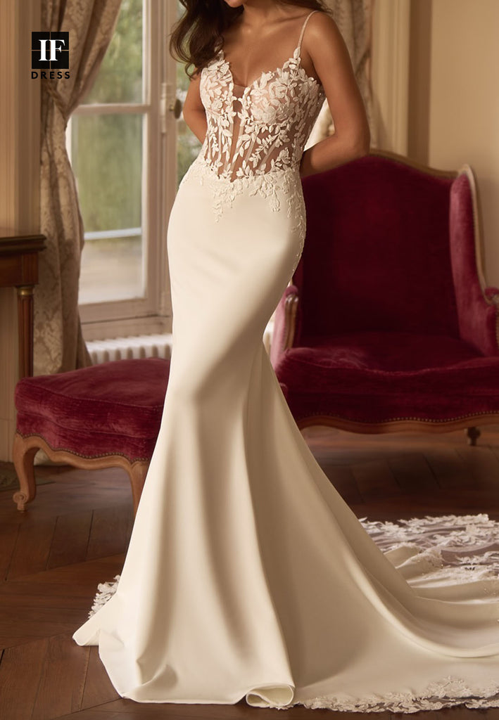 This mermaid wedding dress features a sophisticated V-neckline with delicate spaghetti straps, creating a graceful and modern silhouette. Crafted from smooth satin, the gown incorporates sheer panels adorned with intricate appliques for a refined, elegant look. Sleeveless by design, it accentuates the bride’s figure with expert tailoring, offering a perfect blend of classic charm and contemporary style.