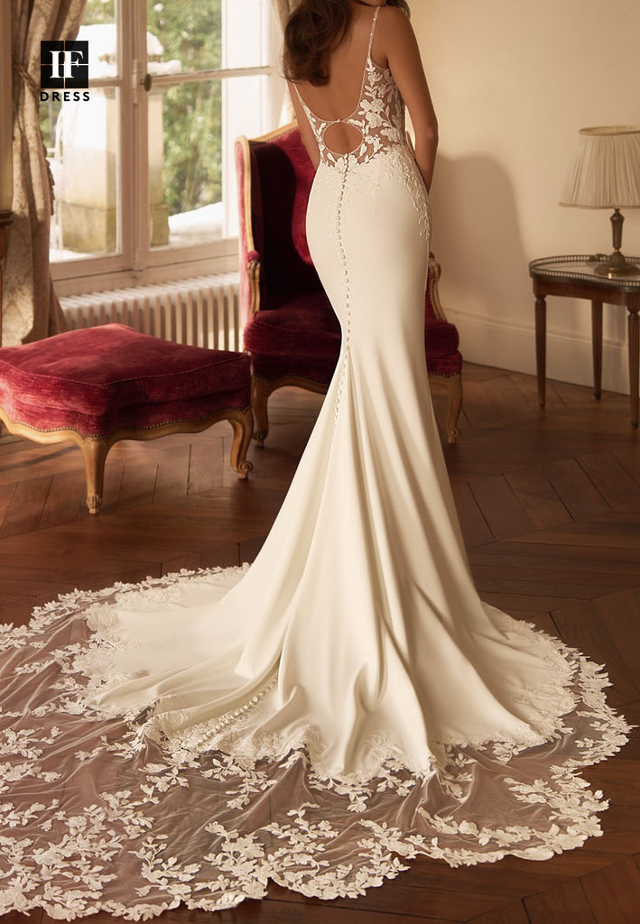 V-Neck Spaghetti Straps Satin Sheer Bride Gowns Sleeveless Applique Mermaid Wedding Dress - As Pic is backordered and will ship as soon as it is back in stock.