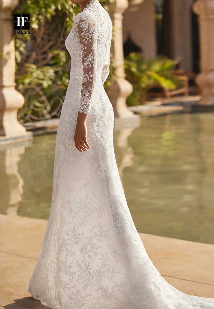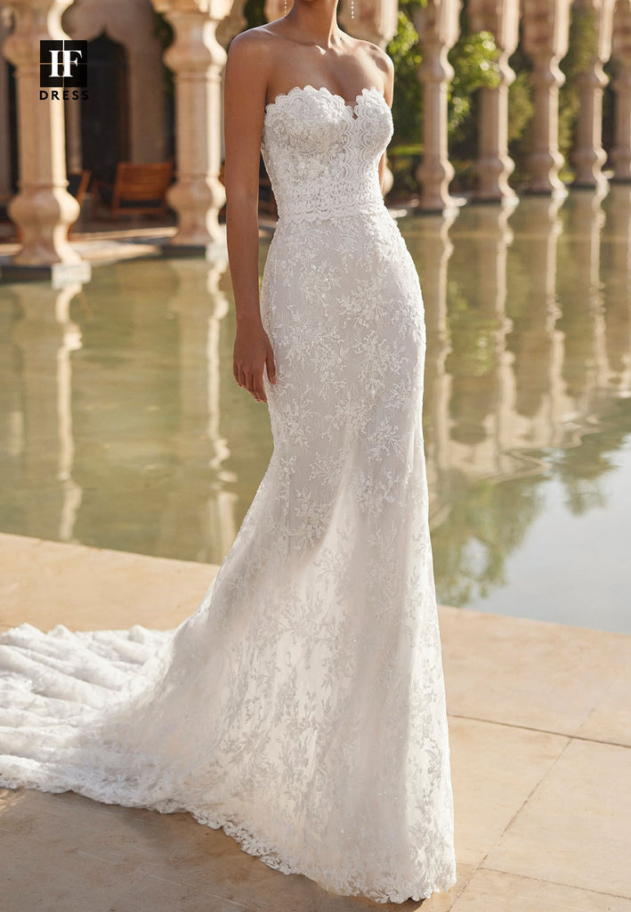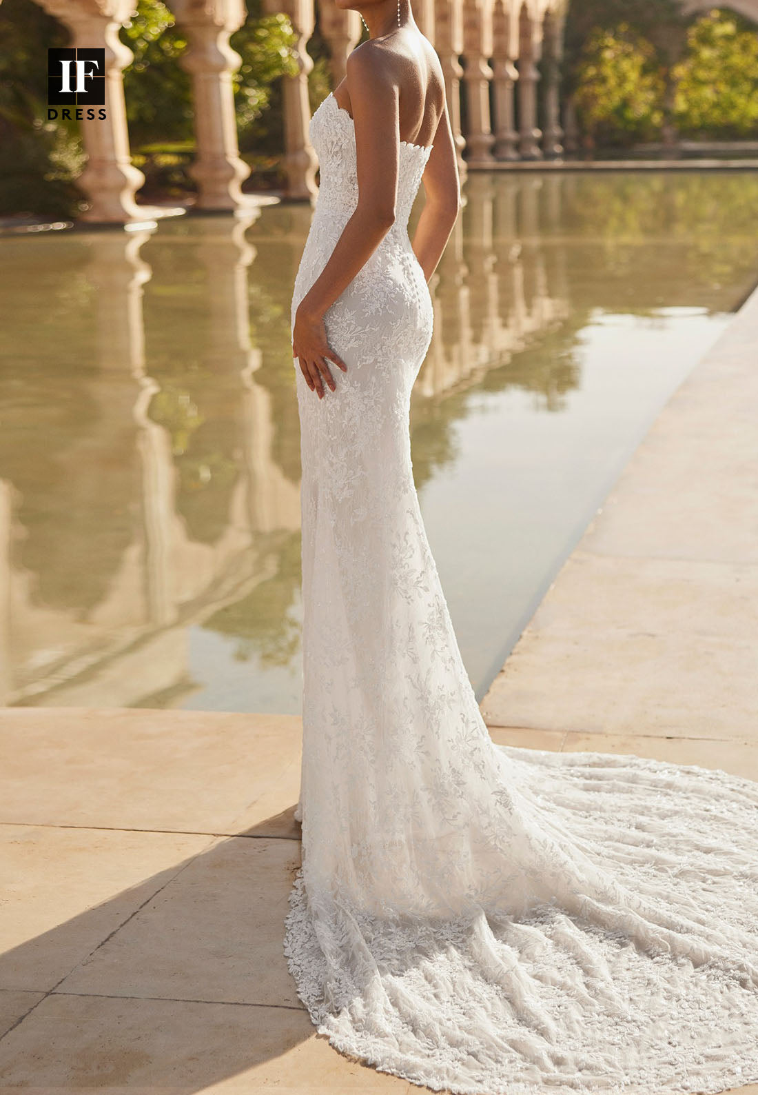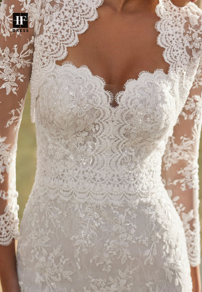 This exquisite two-piece mermaid wedding dress features a sweetheart neckline and is crafted from soft tulle, adorned with allover lace appliques and sequins for a luminous finish. The combination of delicate embellishments and a fitted silhouette enhances the bride’s figure while offering versatility and modern elegance. Perfectly designed for a contemporary yet timeless bridal look.