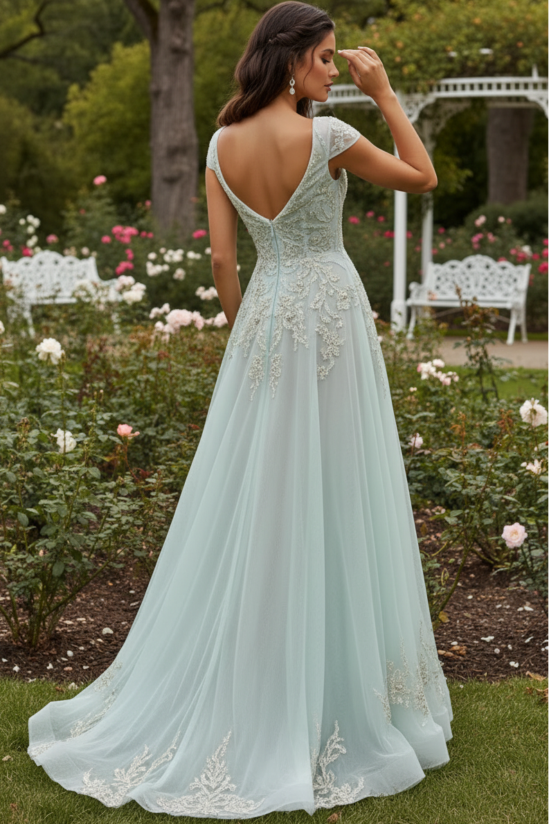V-Neck Cap-Sleeves Beaded Sequined Applique Tulle Pleated Floor-Length A-Line Prom Dress