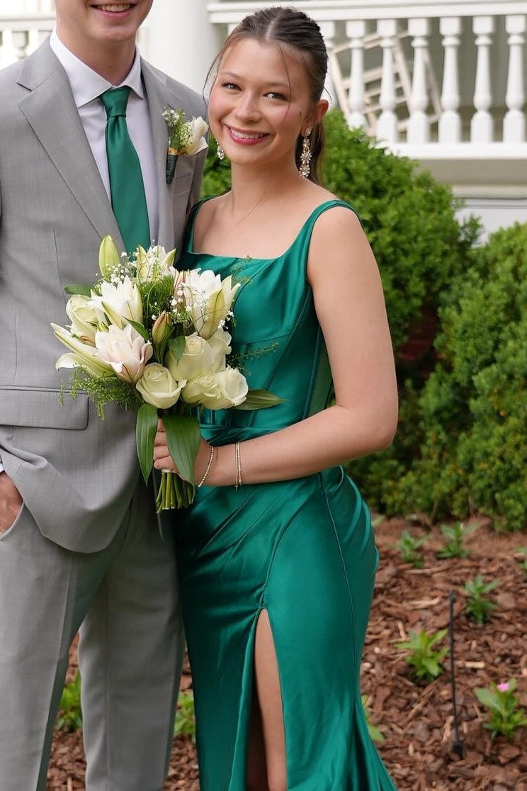 Elevate your prom night with this stunning mermaid silhouette dress. Featuring a sophisticated square neckline with delicate straps and sleeveless design, this gown showcases luxurious satin fabric with intricate pleating details. The dramatic sweep train creates an elegant, flowing effect as you move, while the thigh-high slit adds modern flair and ease of movement. Perfect for making a memorable entrance at any formal event.