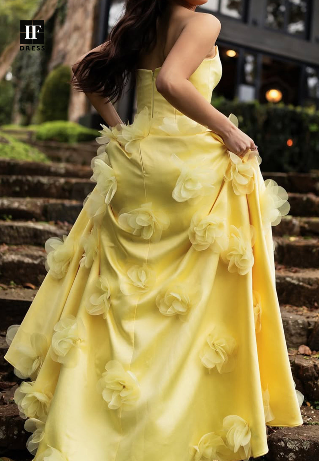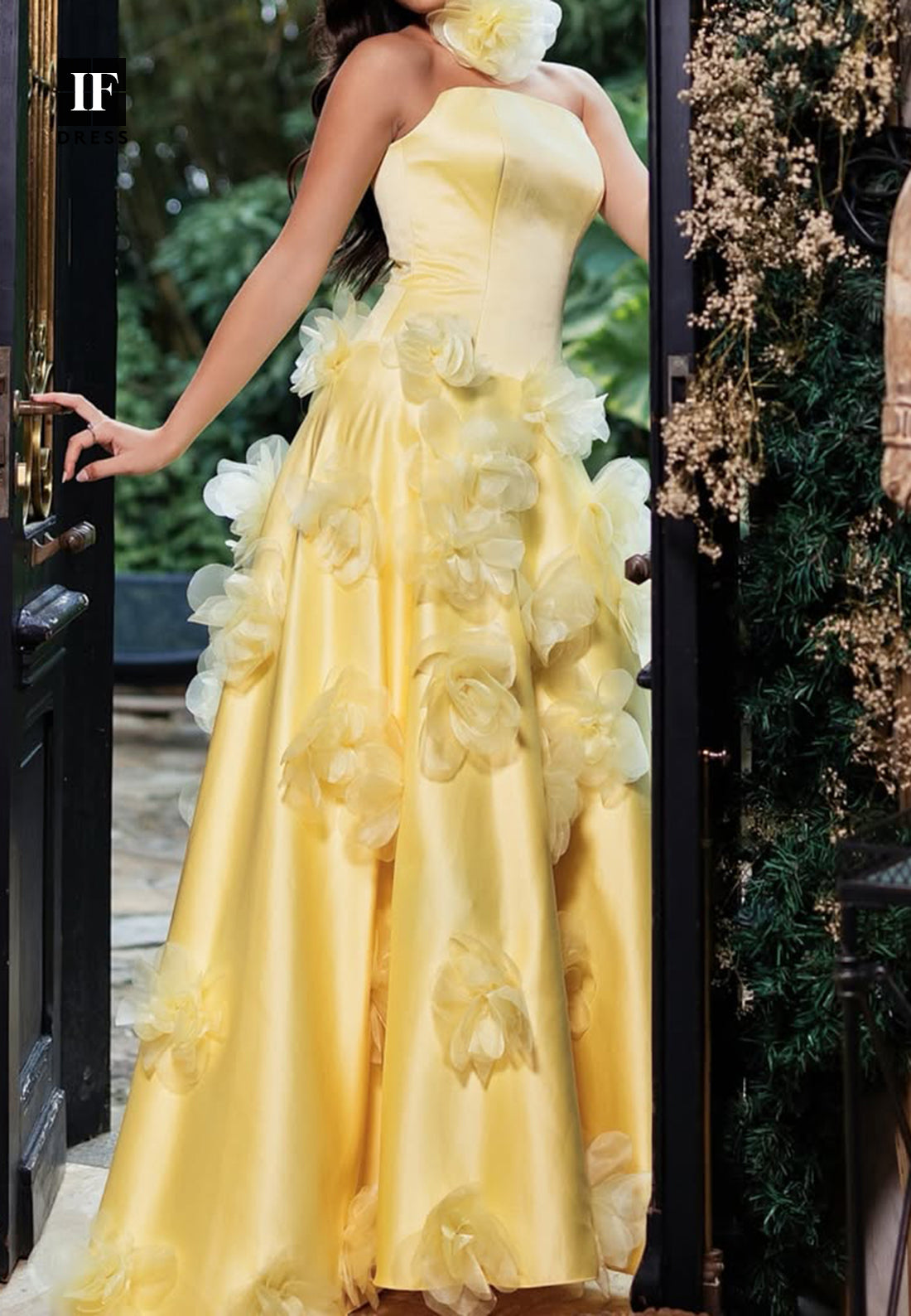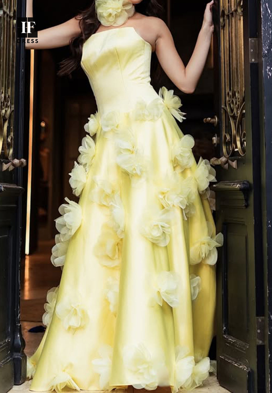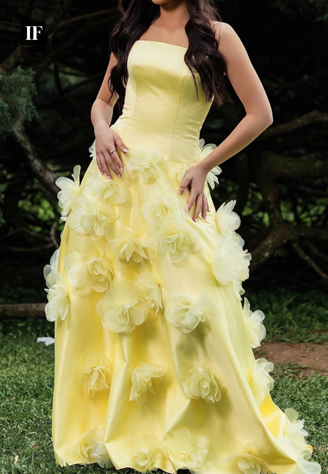 Enchant in this graceful A-line prom dress that celebrates romantic femininity with modern sophistication. The tube top silhouette with off-shoulder styling creates a contemporary, flattering neckline while the sleeveless cut offers refined elegance. Luxurious satin construction provides a smooth, polished foundation that drapes beautifully through the bodice. Ethereal tulle layering adds dimension and movement, while delicate floral embellishments scattered throughout the gown create an enchanting, garden-inspired aesthetic. The classic A-line silhouette flows gracefully from the waist, offering comfort and timeless appeal. Perfect for prom, formal galas, or special celebrations, this dress combines understated luxury with botanical charm for an evening of poised, romantic elegance.