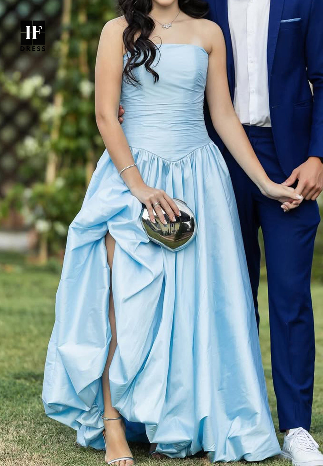 Tube Top Off-Shoulder Sleeveless Floor-Length Satin Pleated A-Line Prom Dress with High Slit - Sky Blue is backordered and will ship as soon as it is back in stock.