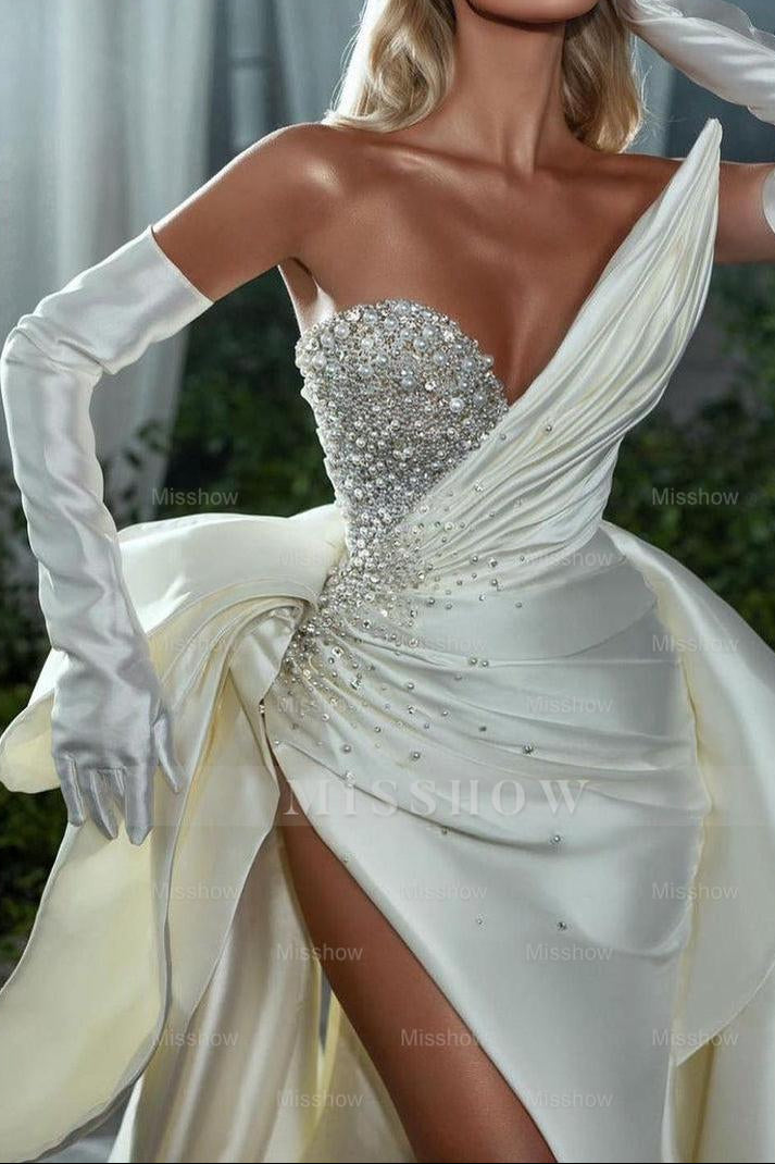 Asymmetrical-Neck Beaded Pearls Sequined Satin Pleated Mermaid Wedding Dress with Gloves - White is backordered and will ship as soon as it is back in stock.