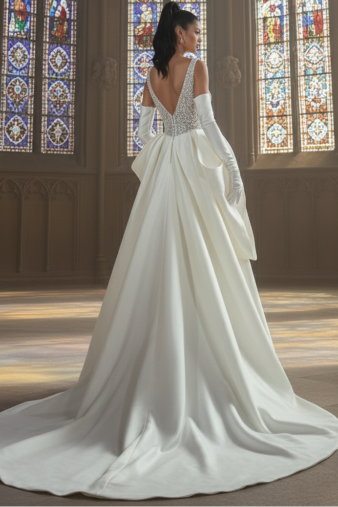 Elevate your bridal look with this exquisitely crafted mermaid gown showcasing an asymmetrical neckline that exudes contemporary elegance. The bodice is meticulously embellished with hand-placed beads, pearls, and sequins that create dimensional sparkle and movement. Constructed from premium satin, the pleated design accentuates the waistline before transitioning into a fitted silhouette that gracefully flares at the knee into a dramatic mermaid train. Complemented by coordinating gloves, this statement piece combines refined craftsmanship with modern sophistication—ideal for the discerning bride who demands both artistry and timeless appeal.