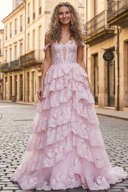 Sweetheart Sleeveless Lace Applique Tulle Pleated Ruffled Tiered A-Line Prom Dress - Pink ist auf Lager und wird versandt, sobald es wieder verfügbar ist
