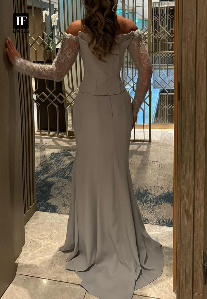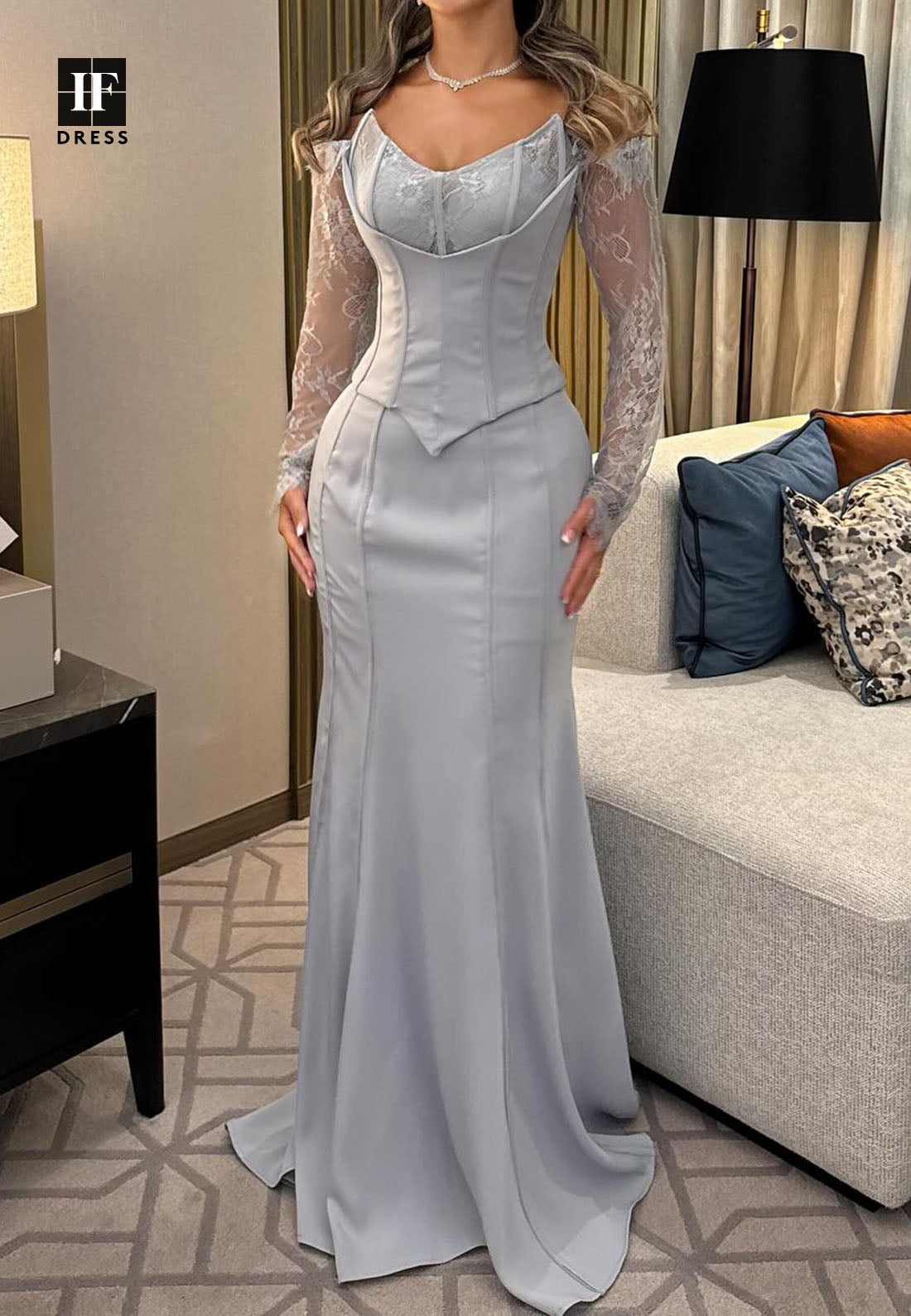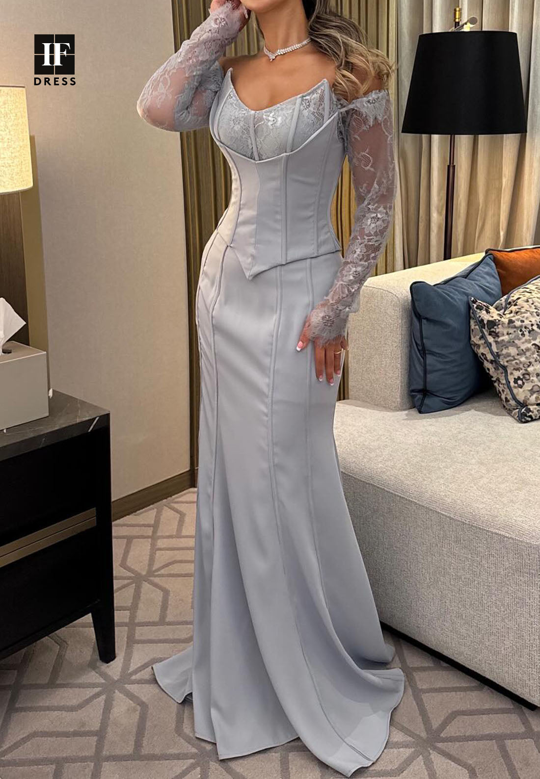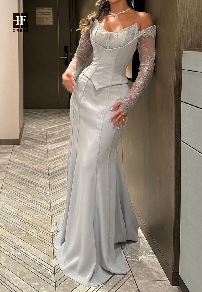 Scoop-Neck Long-Lace-Sleeves Mermaid Evening Dress Off-Shoulder Floor-length Satin Fotmal Gowns