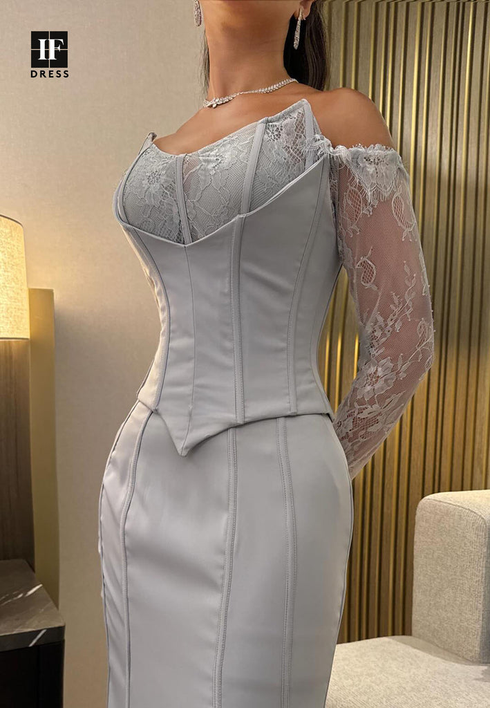 This sophisticated mermaid gown masterfully combines classic elegance with contemporary design through its thoughtful construction and premium materials. The scoop neckline provides a universally flattering frame, while the off-shoulder styling adds modern allure and visual interest. Long lace sleeves offer refined coverage and intricate detailing, creating an ethereal quality that balances the structured silhouette. Crafted from luxurious satin, the bodice drapes beautifully with a smooth, lustrous finish that enhances the gown's formal presence. The fitted mermaid construction hugs the body gracefully before extending to a floor-length hem, creating a dramatic and flattering silhouette. The combination of delicate lace sleeves against sumptuous satin creates a harmonious blend of textures and visual depth. Perfect for prom, formal galas, weddings, and upscale evening events, this gown delivers timeless sophistication through its elegant proportions, premium materials, and refined design details, making it an ideal choice for those seeking understated glamour with contemporary flair.
