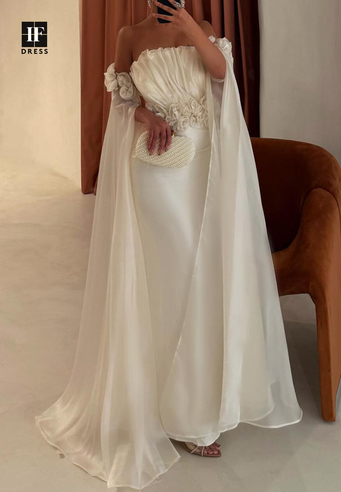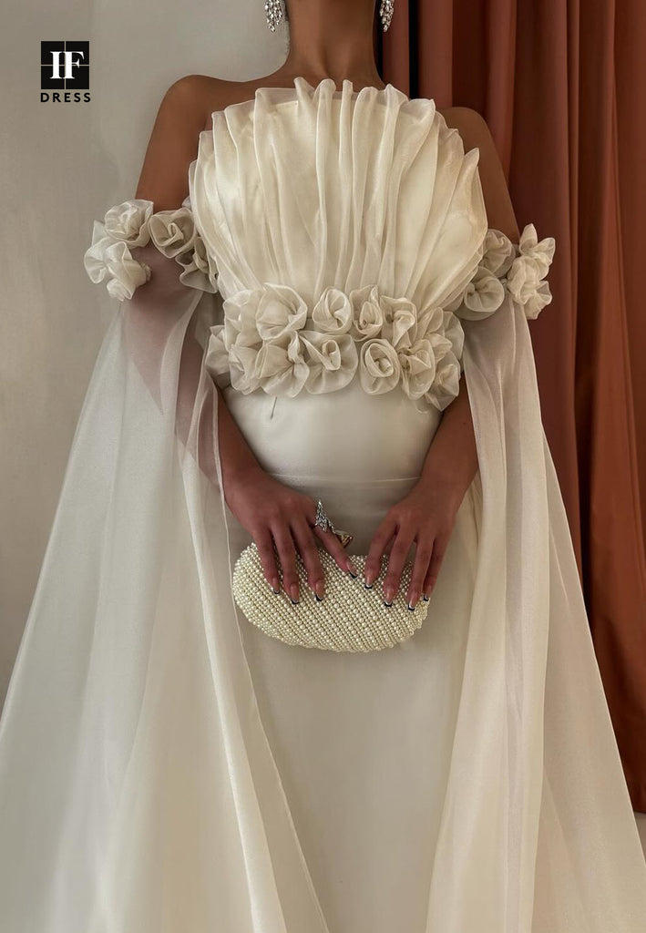 This exquisite mermaid evening gown combines classical elegance with artistic embellishment through its refined design elements. The bateau neckline frames the shoulders and collarbone with timeless sophistication, while graceful cape sleeves add movement and dimension without restricting the arms. Constructed from flowing chiffon, the dress features elegant pleating throughout the bodice that creates texture and visual depth. Intricate floral embellishments enhance the gown with delicate artistry, adding a romantic quality to the formal silhouette. The fitted mermaid construction provides a flattering, body-conscious fit that curves elegantly before sweeping to the floor with dramatic presence. The combination of chiffon's ethereal drape, pleated detailing, and floral embroidery creates a gown that balances contemporary artistry with timeless evening wear sophistication. Perfect for prom, formal galas, and upscale events, this dress is ideal for those seeking a gown that exudes refined elegance, graceful movement, and distinctive character through its harmonious blend of design elements.