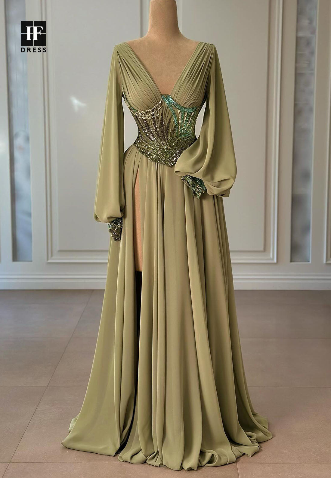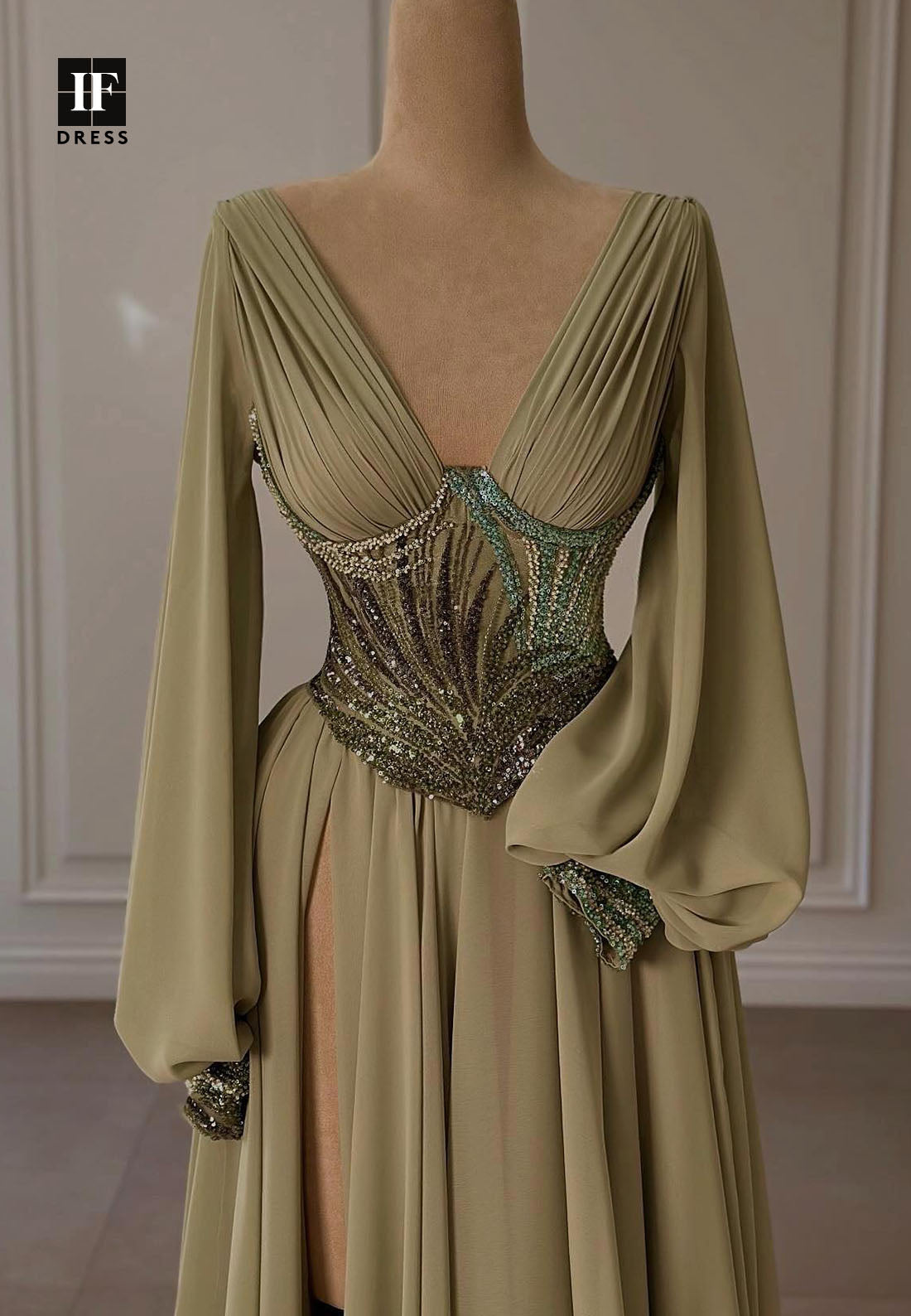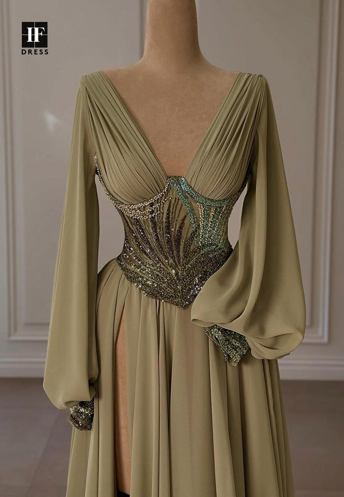 Make a bold statement in this striking A-line evening dress, showcasing a dramatic deep V-neckline that exudes confidence and allure. Long sleeves in flowing chiffon provide elegant coverage while maintaining a contemporary edge. Intricate sequins and beading embellish the bodice with sophisticated sparkle, while pleated detailing throughout creates graceful movement and visual depth. The A-line silhouette flatters all figures with its balanced proportions. Perfect for formal galas, upscale celebrations, and prestigious events, this gown merges modern sensibility with timeless evening wear elegance.