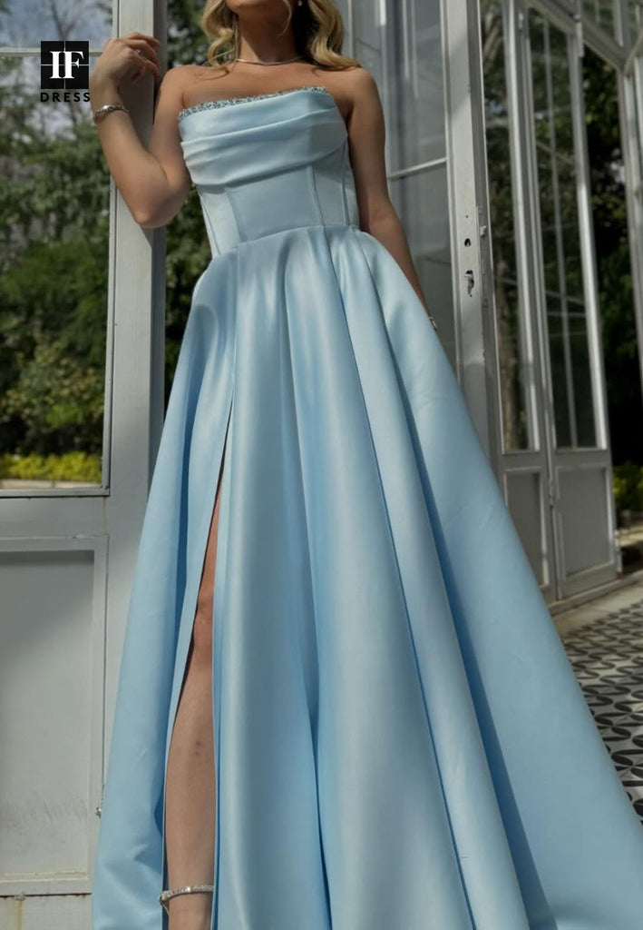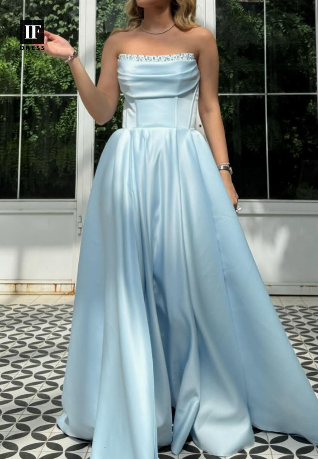This sophisticated A-line evening dress features an off-shoulder, sleeveless design with a bateau neckline that enhances elegance. Crafted from pleated satin, it offers a refined texture and graceful flow. Adorned with delicate beadwork, the gown combines classic tailoring with subtle sparkle, making it ideal for formal occasions that require polished and timeless style.