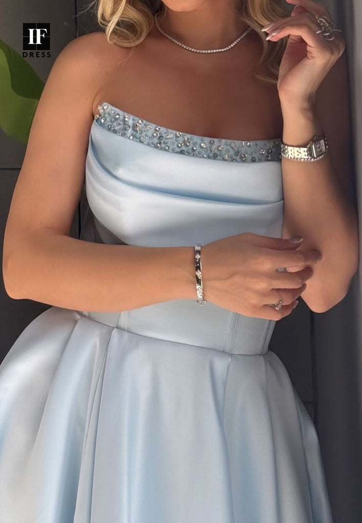 Off-Shoulder Sleeveless Beaded A-Line Evening Dress Bateau-Neck Pleated Satin Formal Gowns