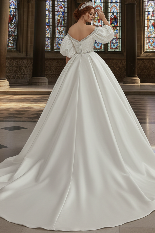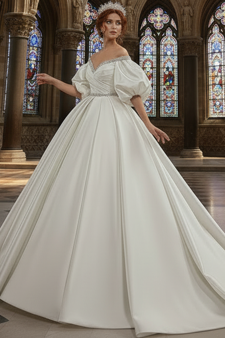 Elevate your bridal vision with this sophisticated wedding dress, masterfully designed to capture timeless elegance. The flattering V-neckline and off-shoulder silhouette create a graceful frame, while voluminous puff sleeves add romantic dimension. Intricate beading adorns the bodice, catching light with every movement. The luxurious satin fabric drapes beautifully through the pleated A-line skirt, offering both structure and fluidity. A sweeping train completes the dramatic, show-stopping look. Perfect for brides seeking a blend of classic refinement and contemporary style, this gown promises an unforgettable entrance down the aisle.