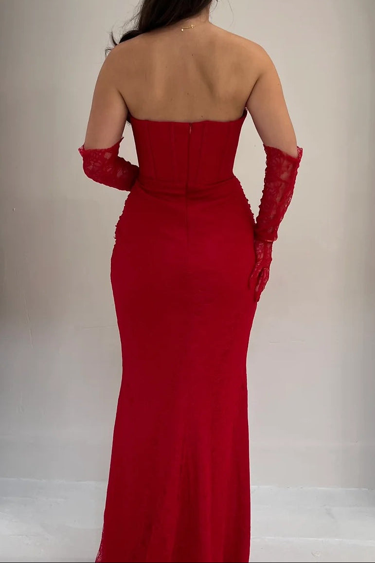 Tube Top Beaded Chiffon Pleated Floor-Length Mermaid Formal Prom Dress with Long-Gloves