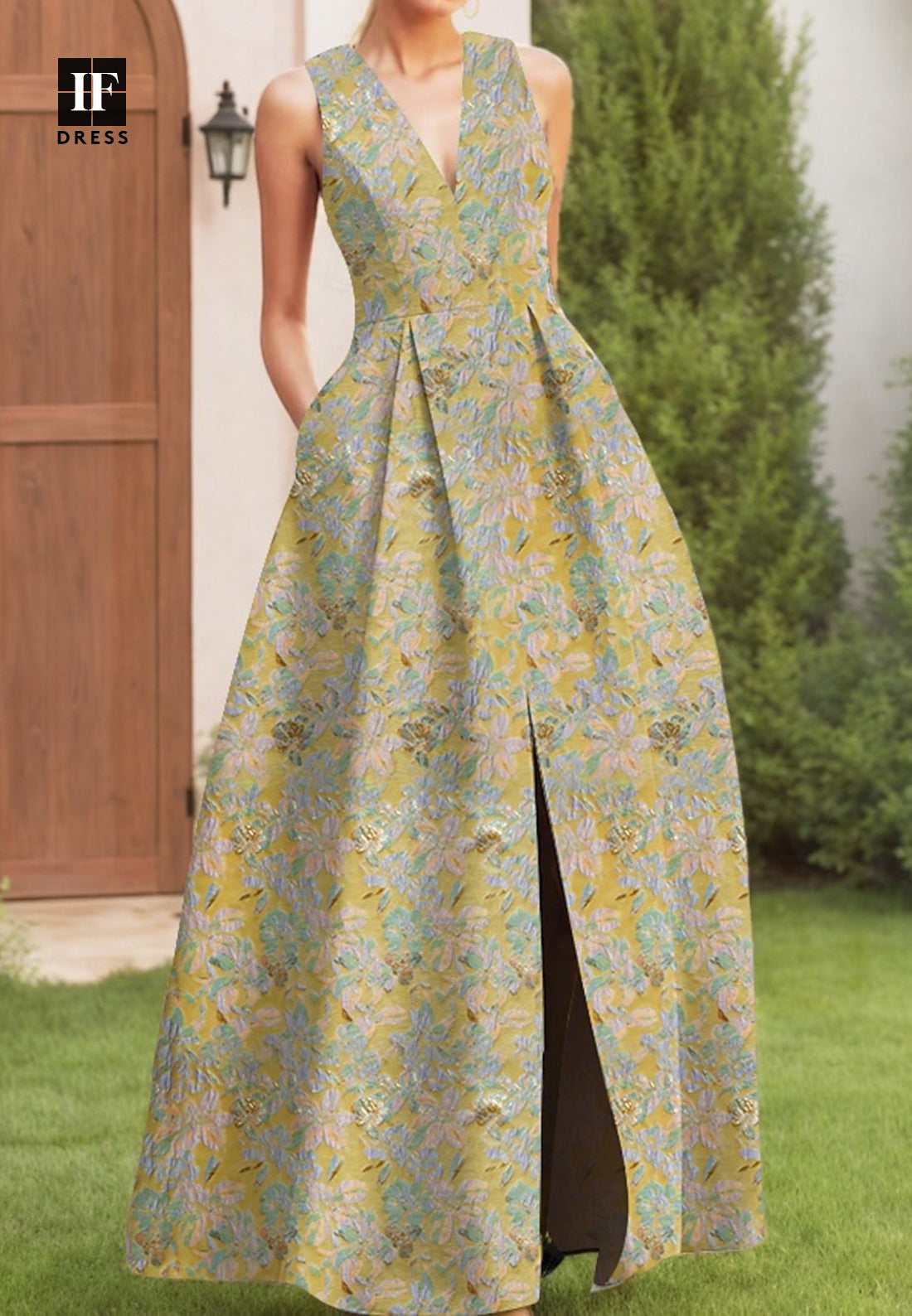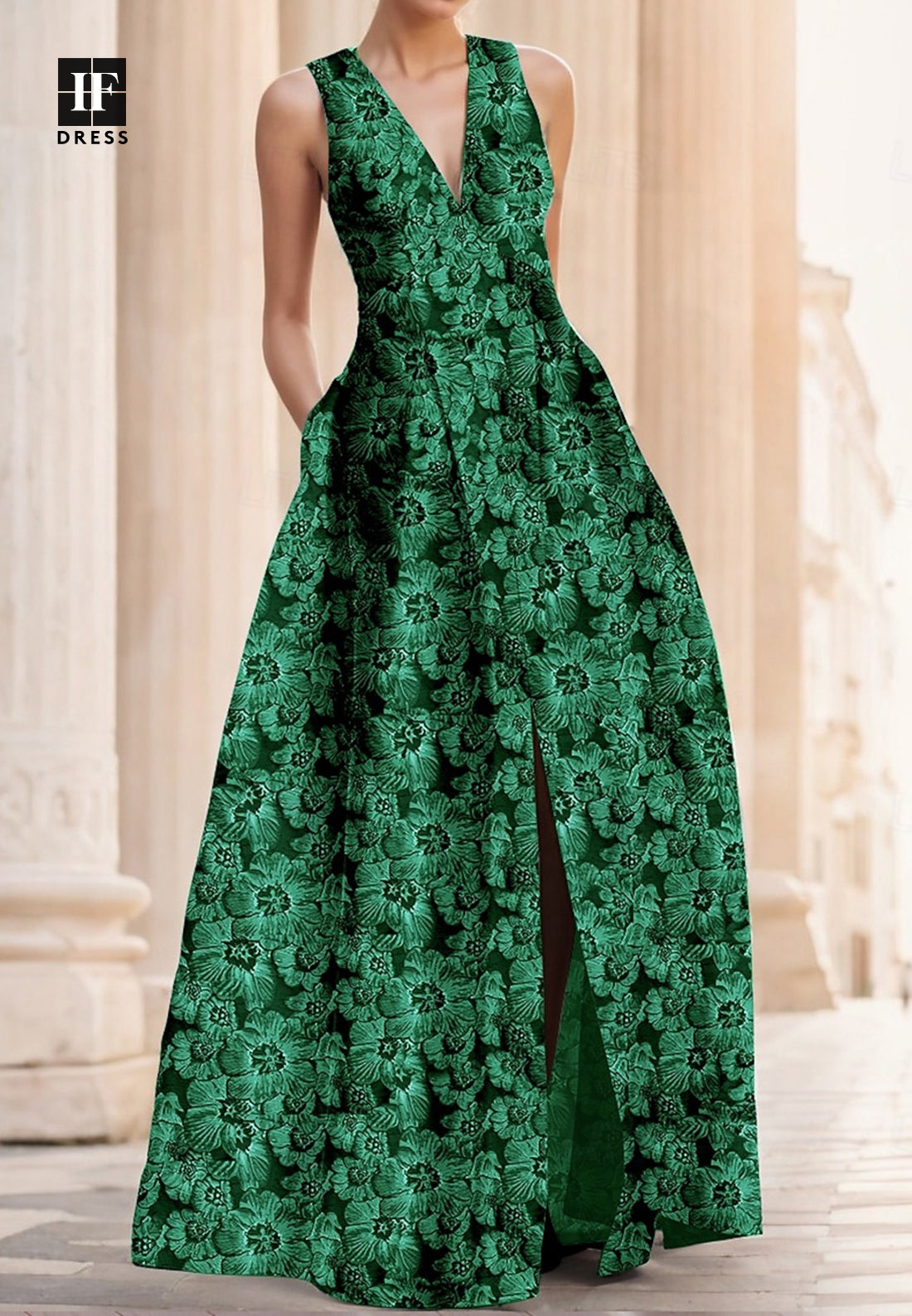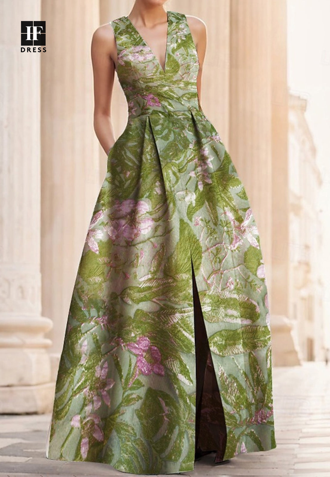Elevate your evening with this sophisticated A-line gown. The deep V-neckline and delicate straps create an elegant silhouette, while the jacquard satin fabric drapes beautifully. Pleated detailing adds dimension and movement, flowing gracefully to the floor. Perfect for formal events, galas, and special occasions where timeless elegance matters.