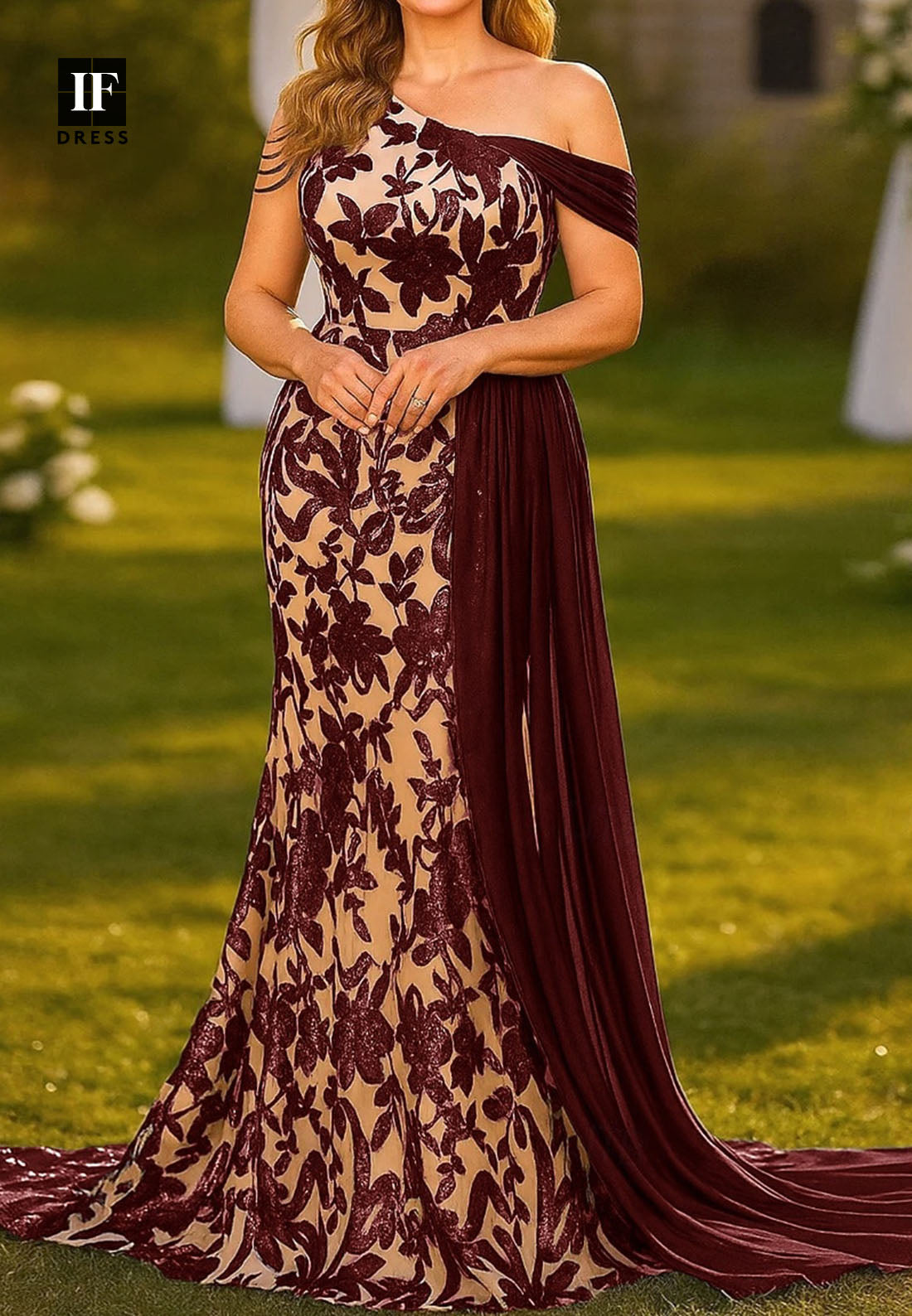 Asymmetrical-Neck One-Strap Sleeveless Sequined Applique Tulle Pleated Mermaid Evening Dress