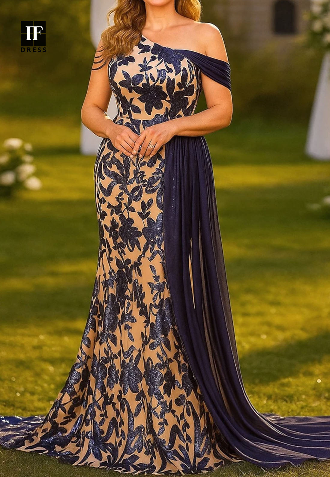 Stand out with this avant-garde evening dress featuring an asymmetrical neckline and striking one-strap design that creates an unexpected silhouette. Sleeveless styling showcases the shoulders while sequined appliqués add dimensional sparkle against soft tulle. Intricate pleating throughout the bodice provides architectural interest and movement. The mermaid cut hugs the body elegantly before flaring at the hem for dramatic impact. This fashion-forward piece merges contemporary design with evening sophistication, making it perfect for upscale events, fashion-forward galas, and occasions where you want to make a memorable impression with bold, refined style.
