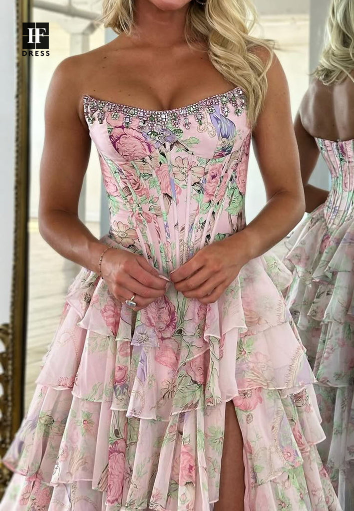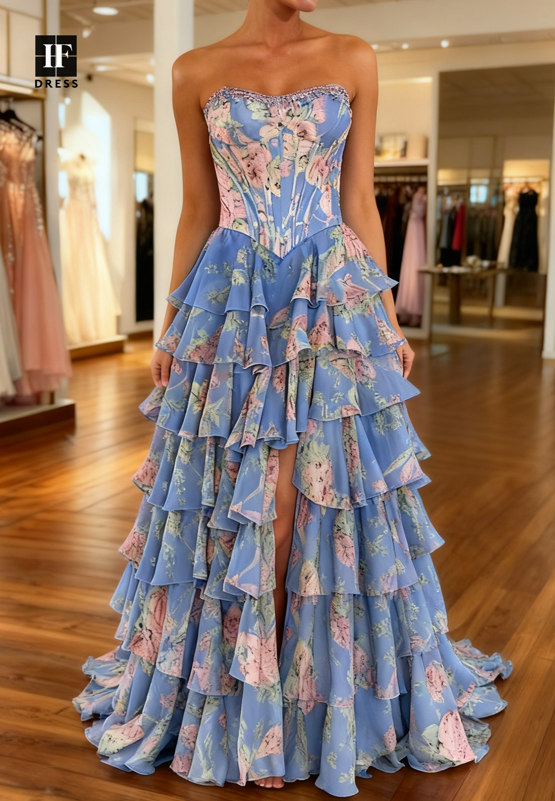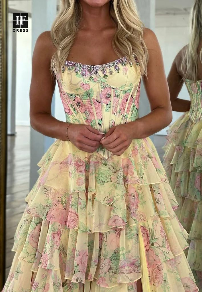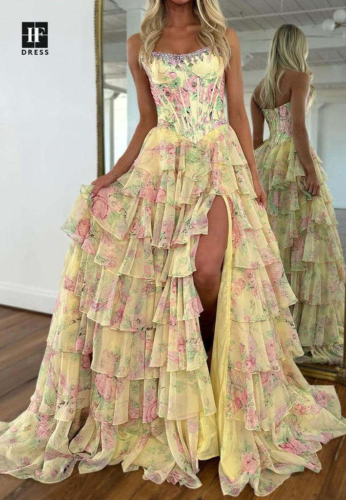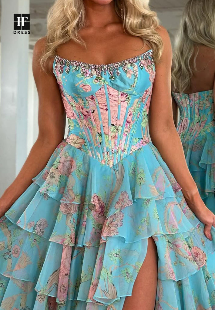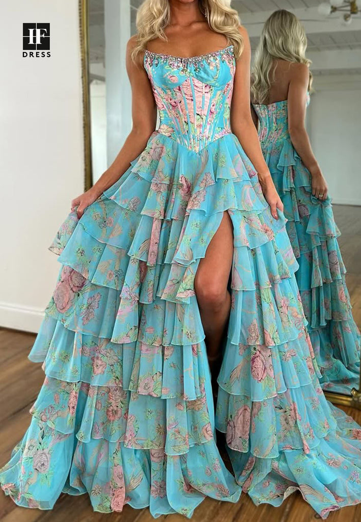 Make a stunning entrance in this sophisticated prom dress featuring a flattering scoop neckline and sleeveless silhouette. The tiered A-line skirt creates graceful movement and dimension, while delicate beading and pleated details add refined elegance. Crafted from luxurious print chiffon, this gown drapes beautifully and offers comfortable wear throughout the evening. The high slit provides modern flair and ease of movement. Perfect for prom, formal events, or special occasions where you want to command attention with timeless style and impeccable craftsmanship.