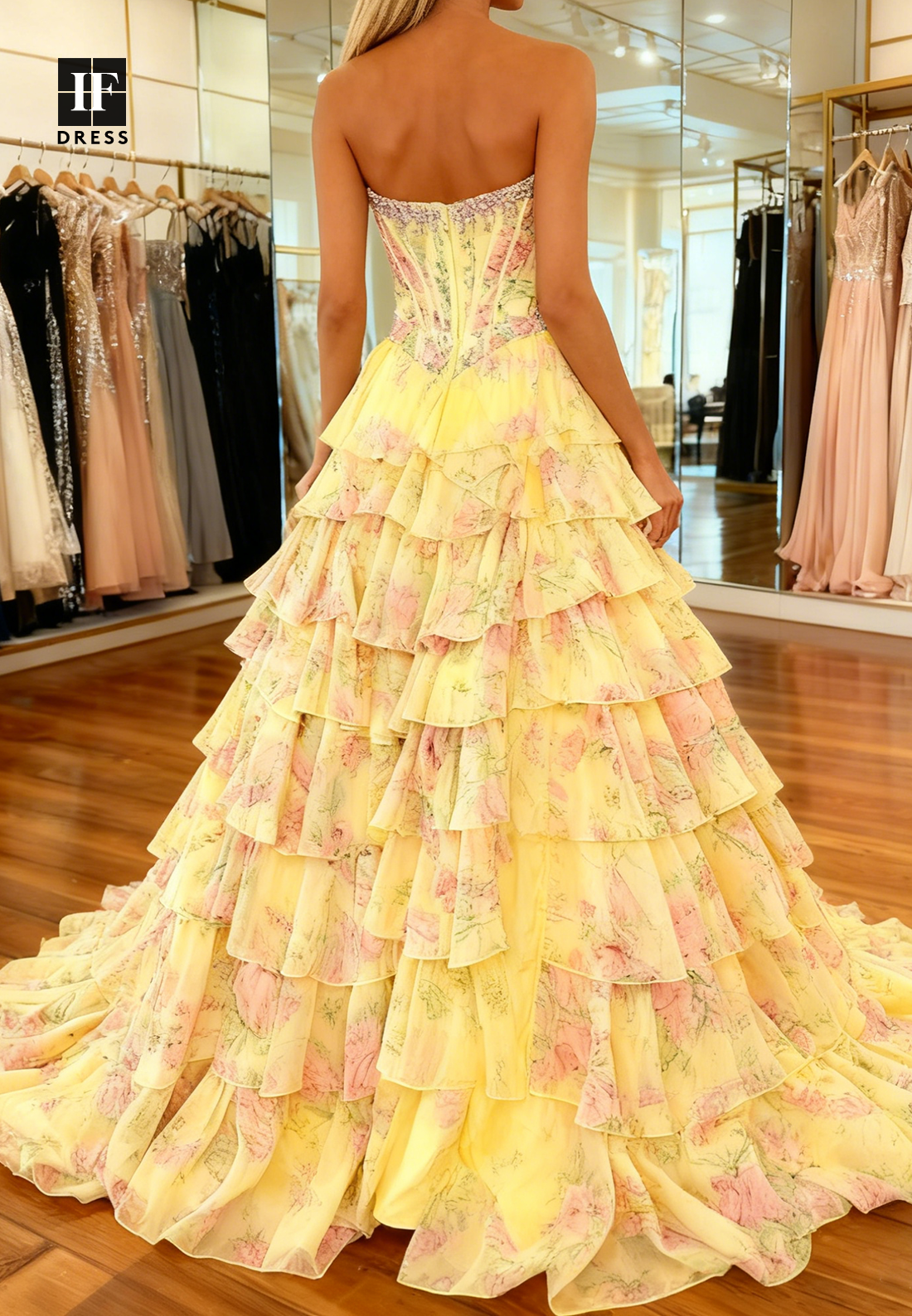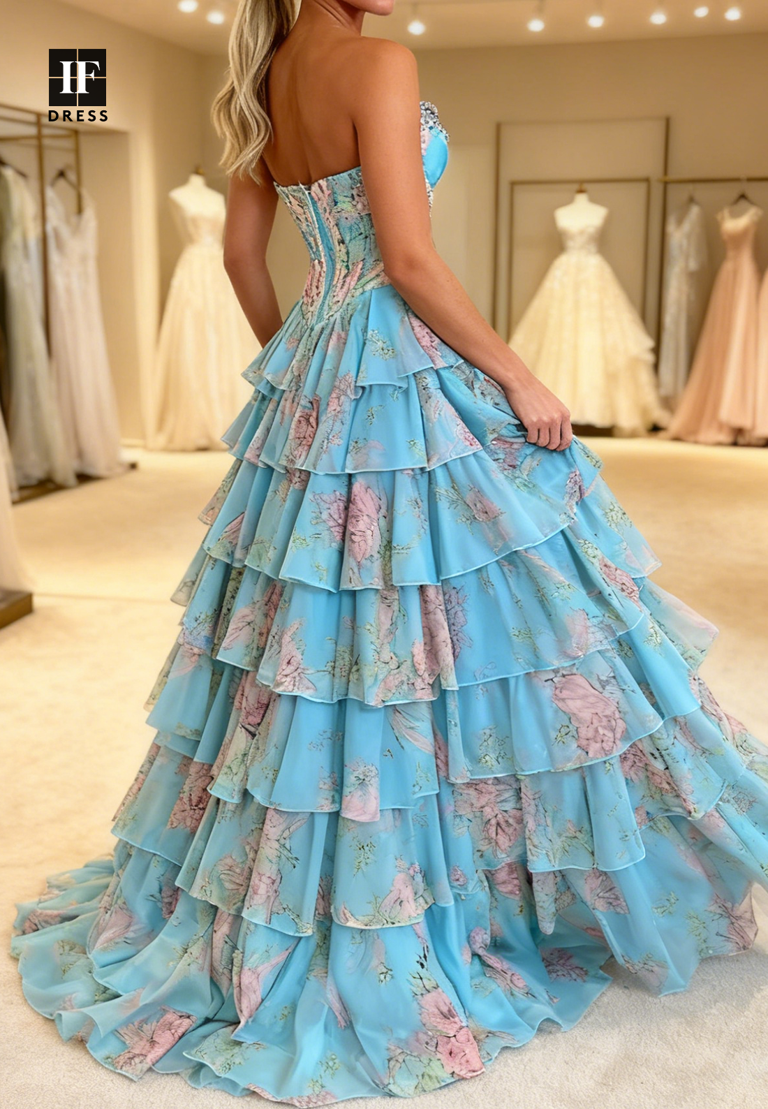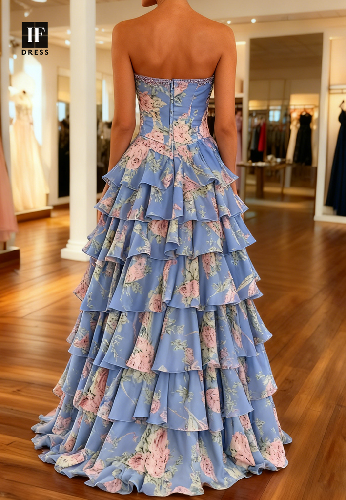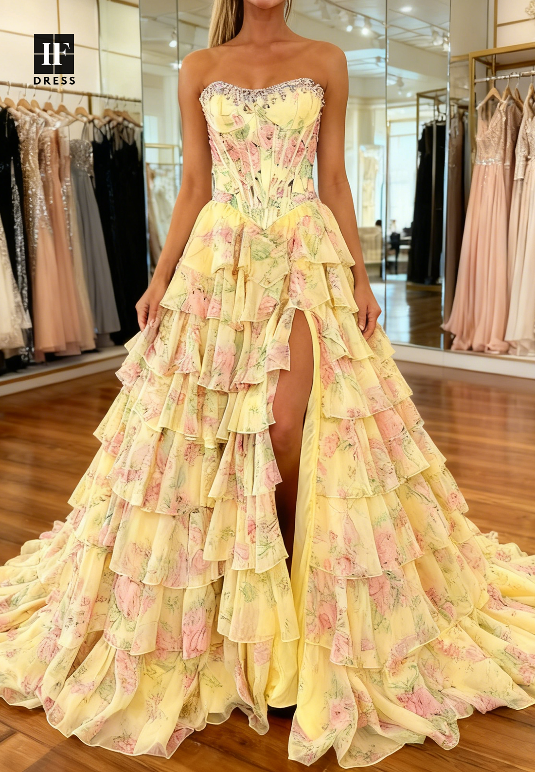 Make a stunning entrance in this sophisticated prom dress featuring a flattering scoop neckline and sleeveless silhouette. The tiered A-line skirt creates graceful movement and dimension, while delicate beading and pleated details add refined elegance. Crafted from luxurious print chiffon, this gown drapes beautifully and offers comfortable wear throughout the evening. The high slit provides modern flair and ease of movement. Perfect for prom, formal events, or special occasions where you want to command attention with timeless style and impeccable craftsmanship.