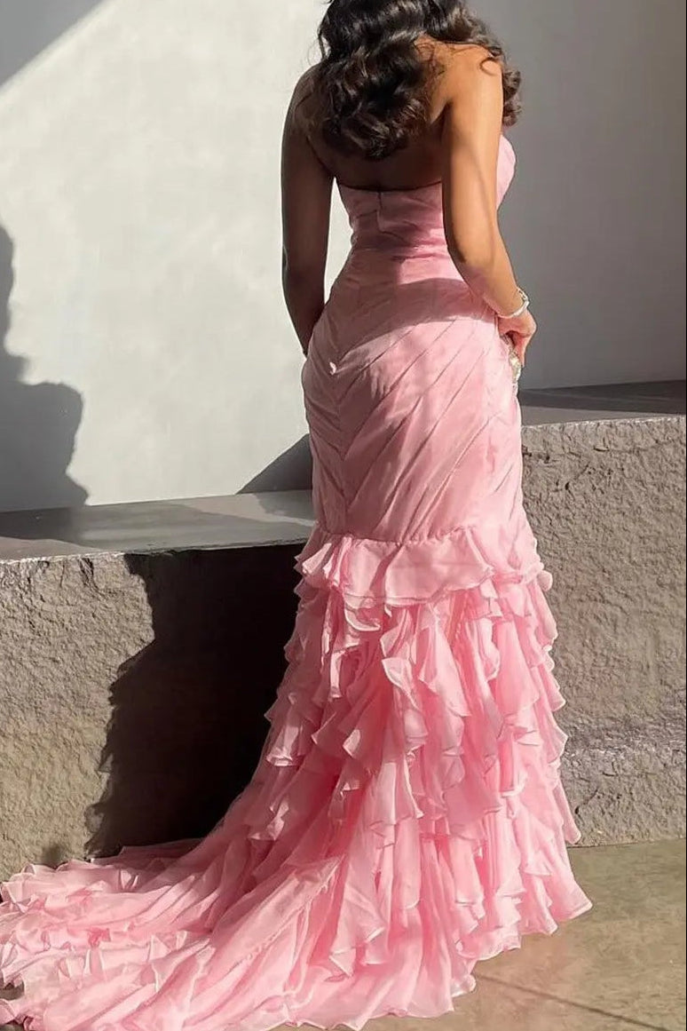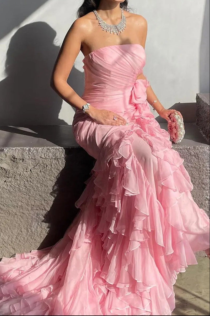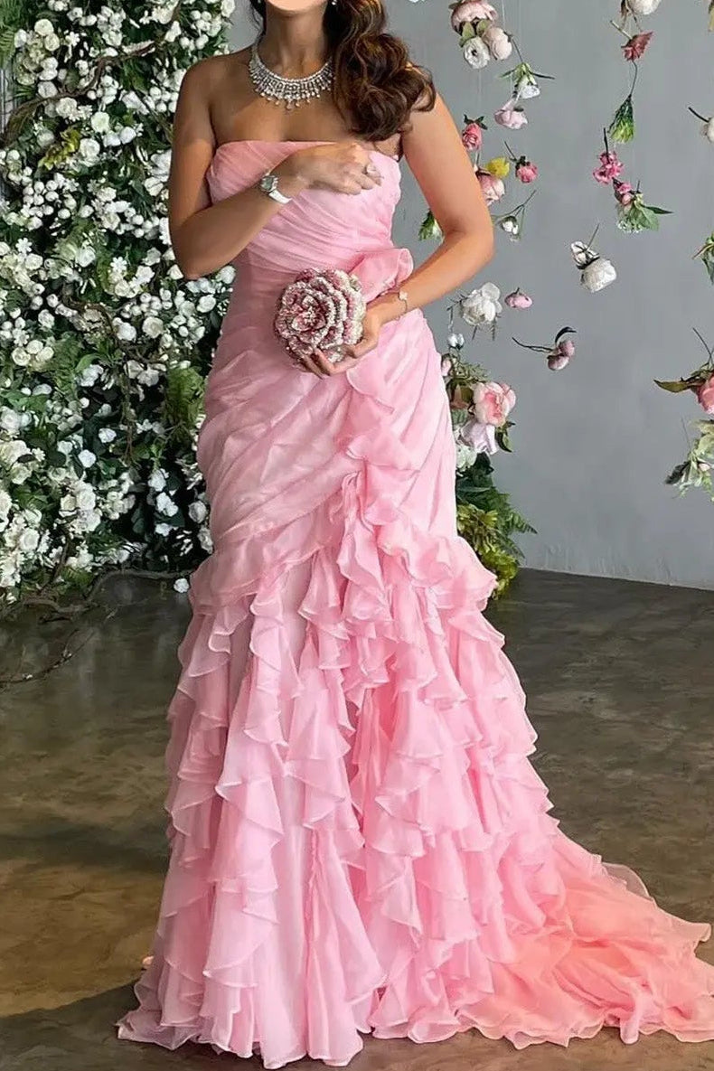 Tube Top Sleeveless Chiffon Pleated Ruffled Tiered Mermaid Formal Prom Dress with Sweep Train