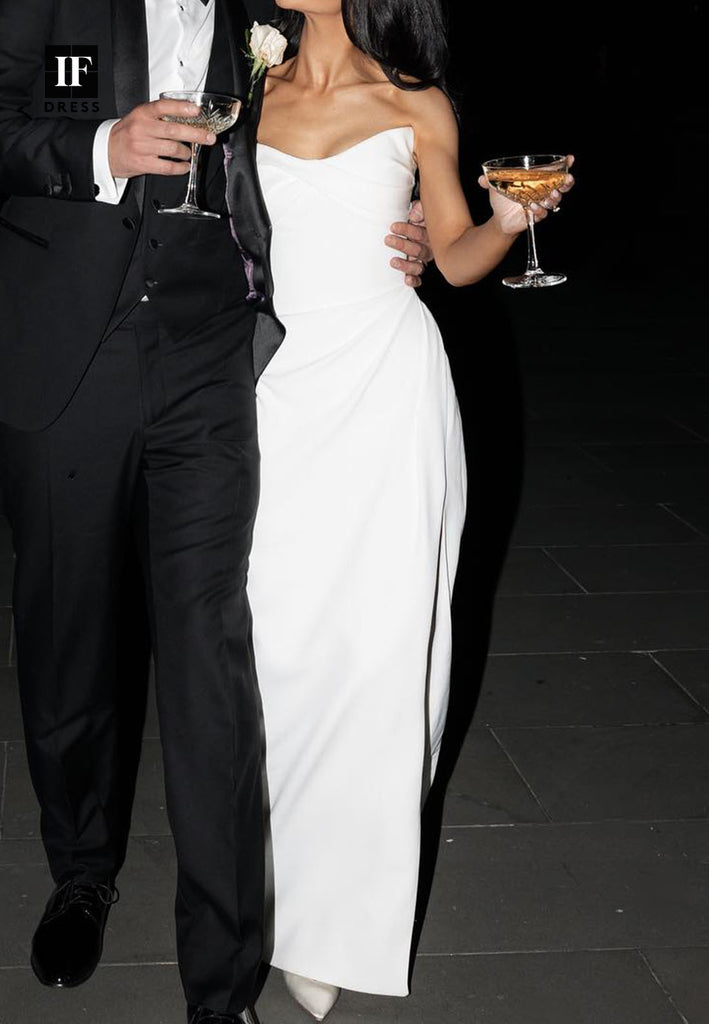 Simple Tube Top Off-Shoulder Sleeveless Pleated Satin Mermaid Wedding Dress with Sweep Train