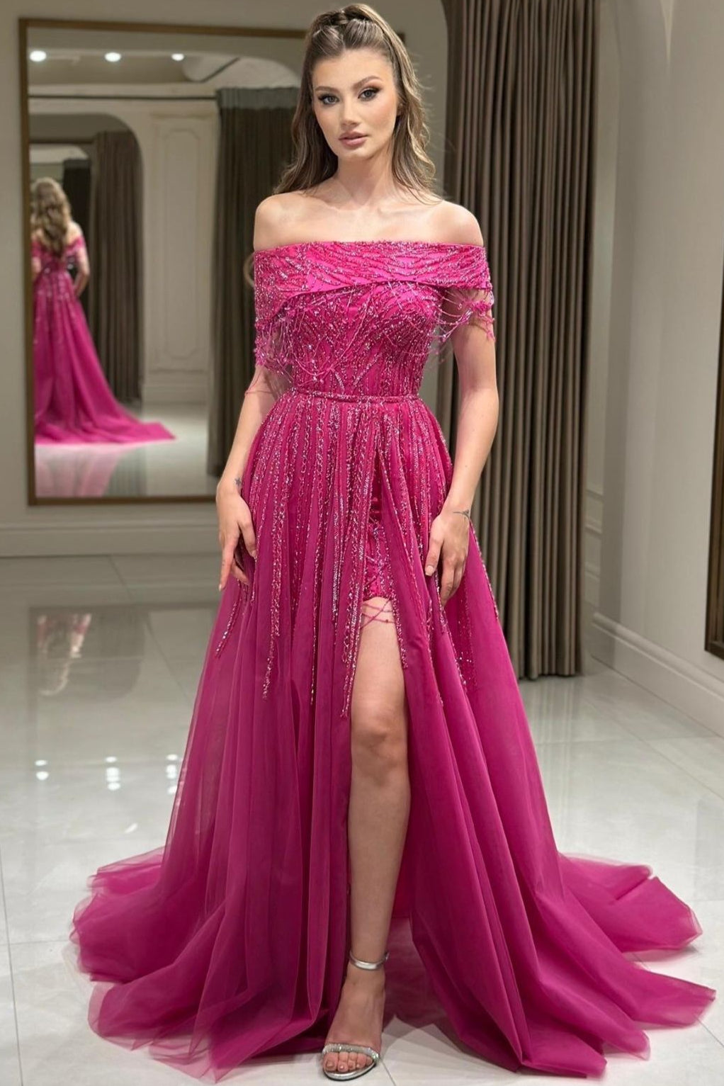 Tube Top Sleeveless Fully Sequined Beaded Tulle Pleated Two Piece A-Line Prom Dress - Fuchsia ist auf Lager und wird versandt, sobald es wieder verfügbar ist
