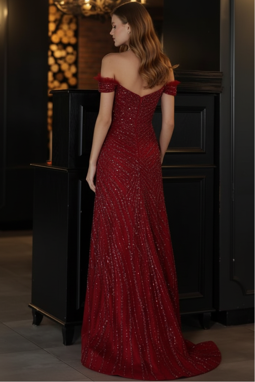 Asymmetrical-Neck Fully Sequined Beaded Tulle Pleated High Slit A-Line Prom Dress - Burgundy ist auf Lager und wird versandt, sobald es wieder verfügbar ist