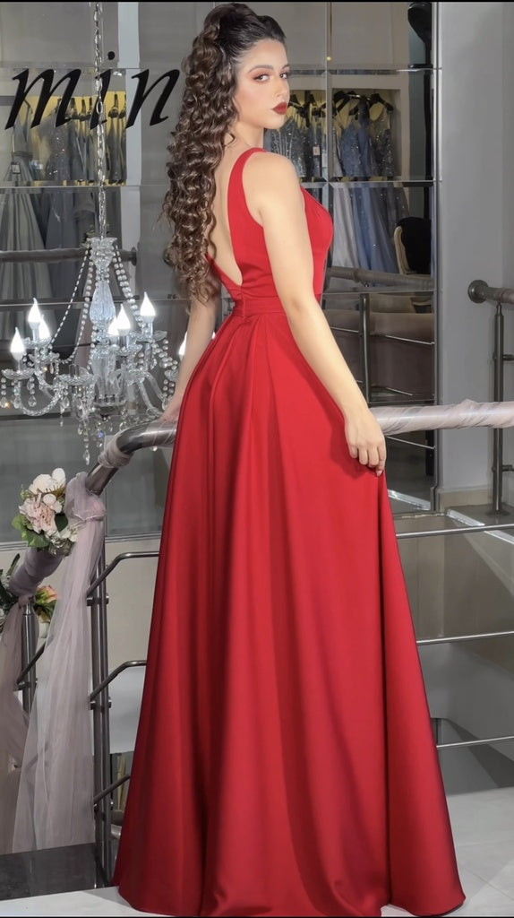Deep V-Neck Straps Sleeveless Satin Pleated Floor-Length High Slit A-Line Prom Dress - Red ist auf Lager und wird versandt, sobald es wieder verfügbar ist