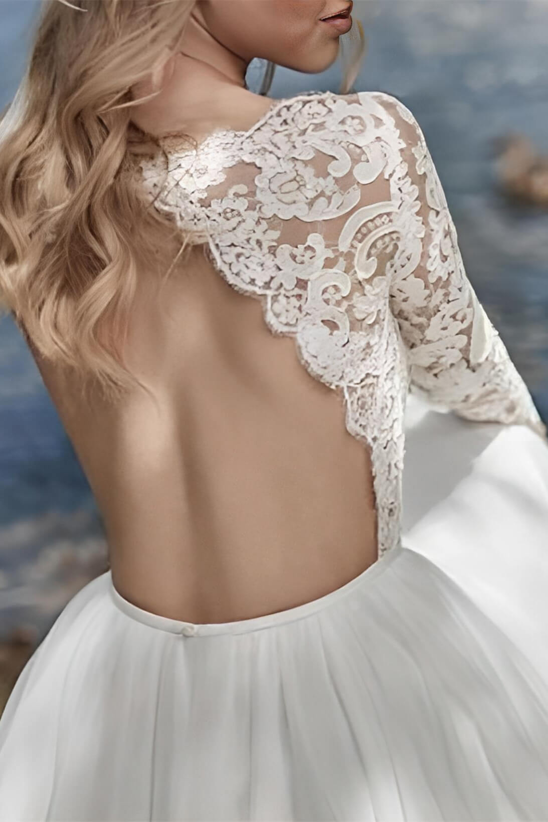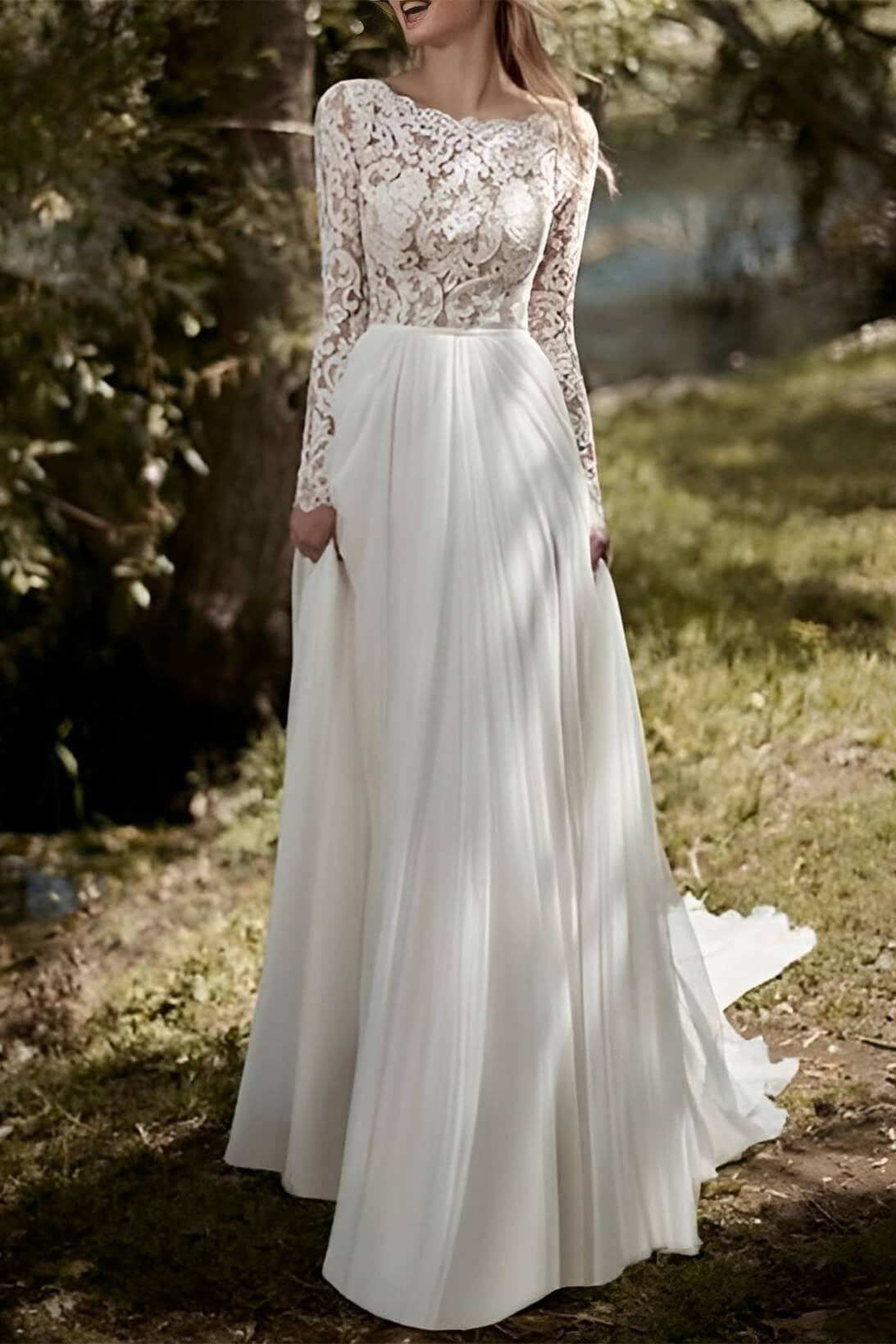 Scoop-Neck Long-Sleeves Lace Applique Chiffon Pleated A-Line Wedding Dress with Train