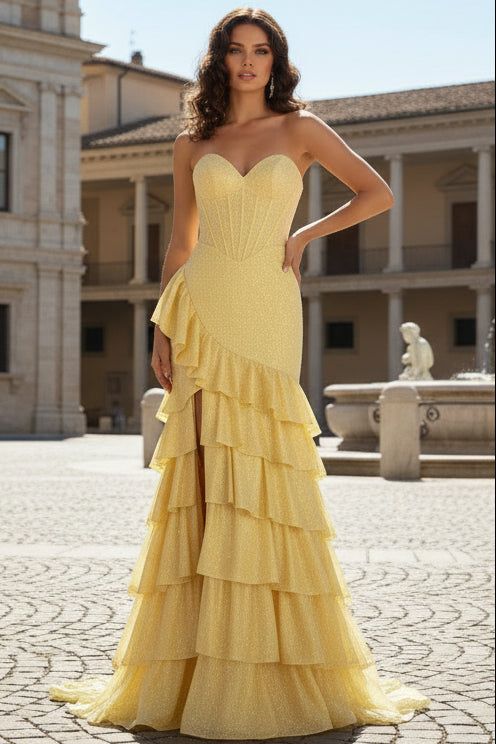 Sweetheart Sleeveless Fully Sequined Satin Pleated Ruffled Tiered Mermaid Prom Dress