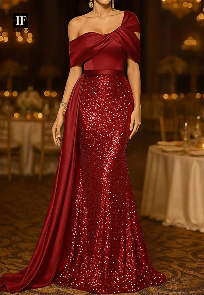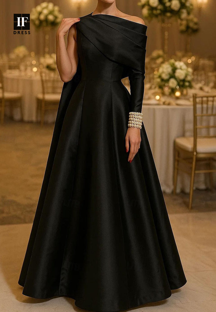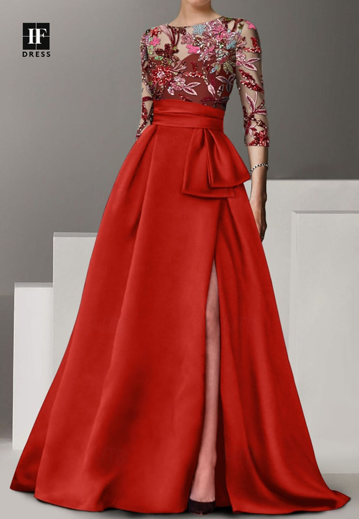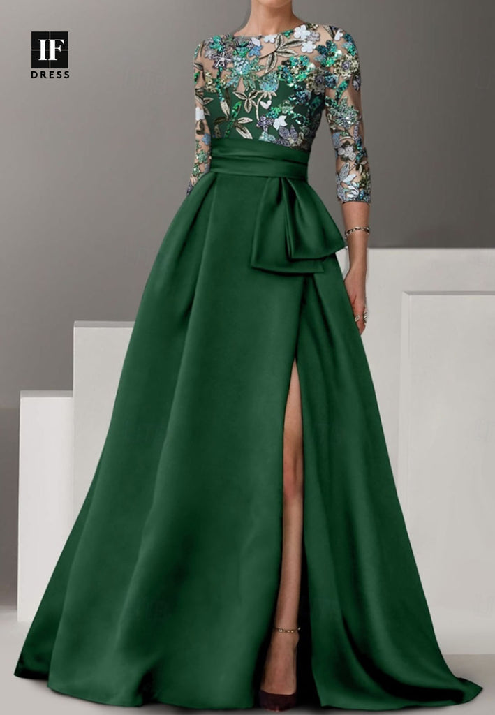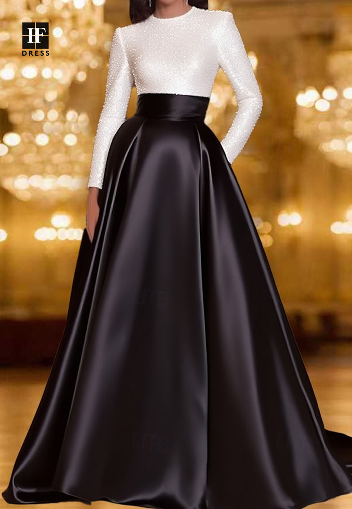 Scoop-Neck Long-Sleeves Floor-length Formal Gowns Sequined Beaded Satin A-Line Evening Dress