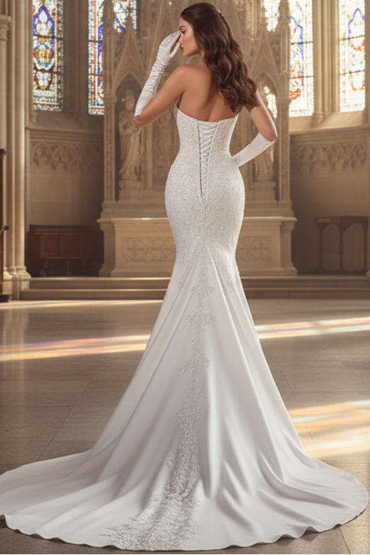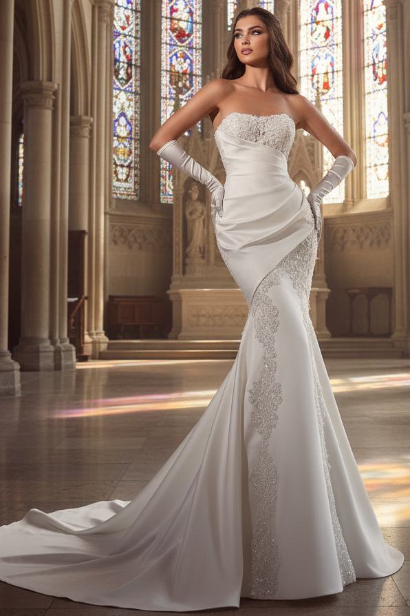 This exquisite mermaid wedding dress combines timeless elegance with contemporary glamour. The sweetheart neckline offers a romantic silhouette, while hand-placed sequined appliqués create captivating sparkle and texture throughout. Premium satin fabric provides a luxurious drape with a subtle sheen, complemented by strategically placed pleats that enhance the gown's silhouette and movement. The dramatic pleated train commands attention as you walk down the aisle, making a memorable statement. Coordinating gloves complete the sophisticated bridal look. Perfect for brides who desire a show-stopping gown that balances classic romance with modern refinement.
