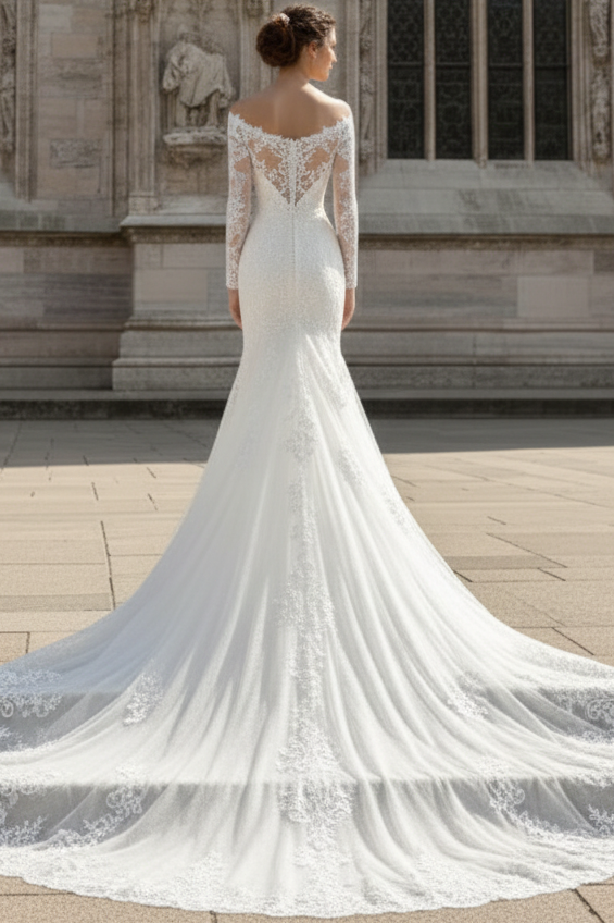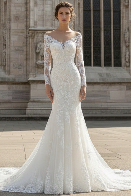 V-Neck Long-Sleeves Lace Applique Tulle Trumpet Mermaid Wedding Dress with Train