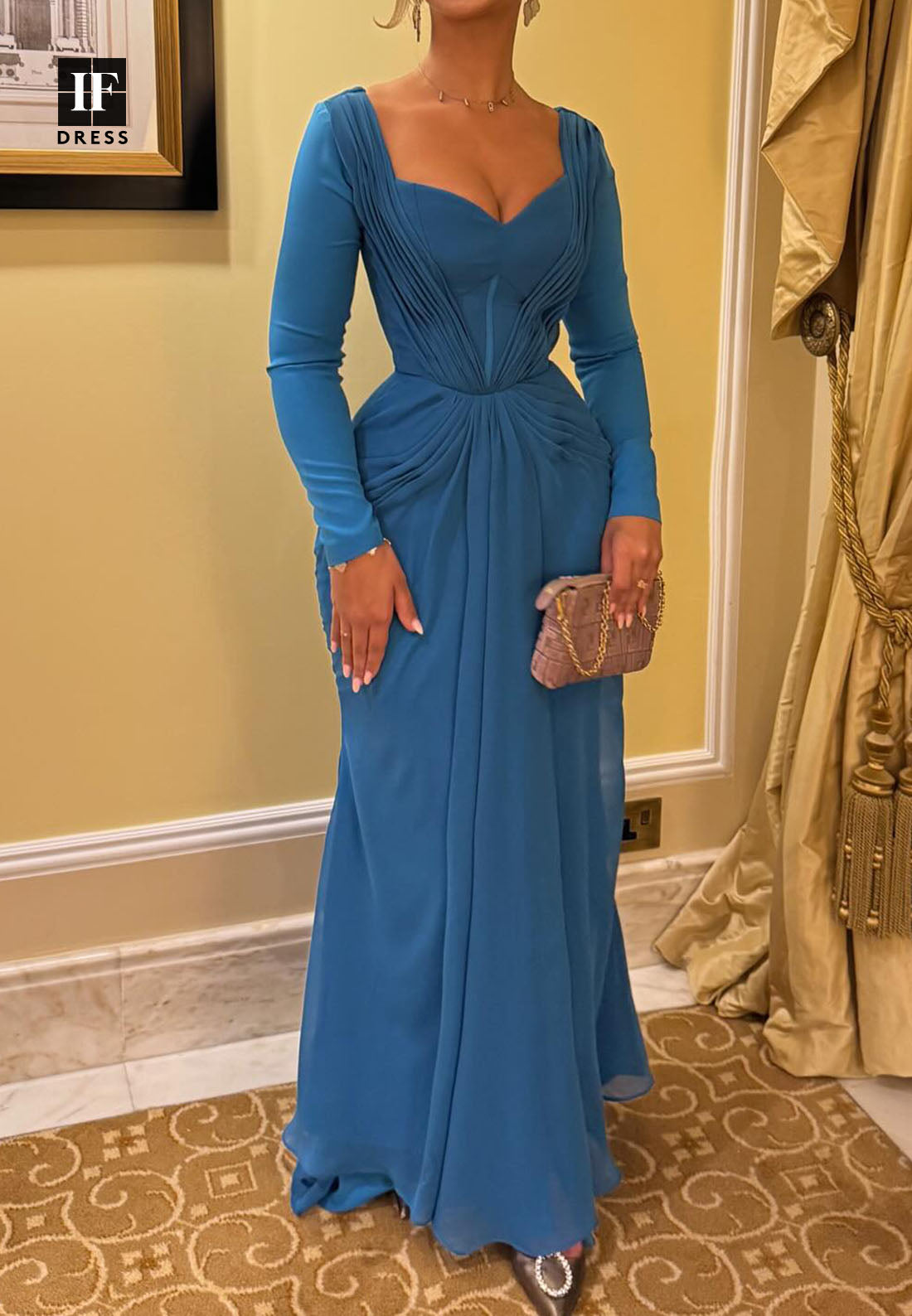 This mermaid evening dress features a sophisticated V-neck paired with long sleeves for an elegant silhouette. Made from pleated chiffon, it offers lightweight movement and graceful flow. The floor-length design enhances its formal appeal, making it an ideal choice for upscale events and refined occasions.
