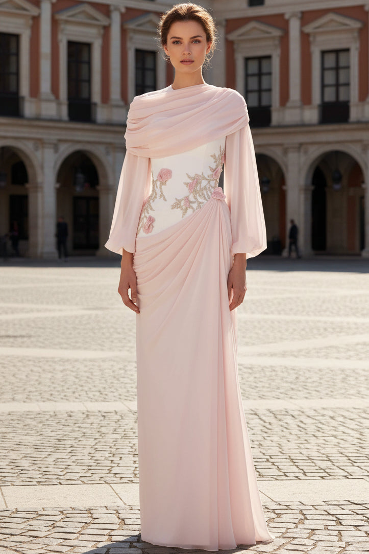 Scoop-Neck Long-Sleeves Sequined Applique Chiffon Pleated Two Piece Fitted Evening Dress
